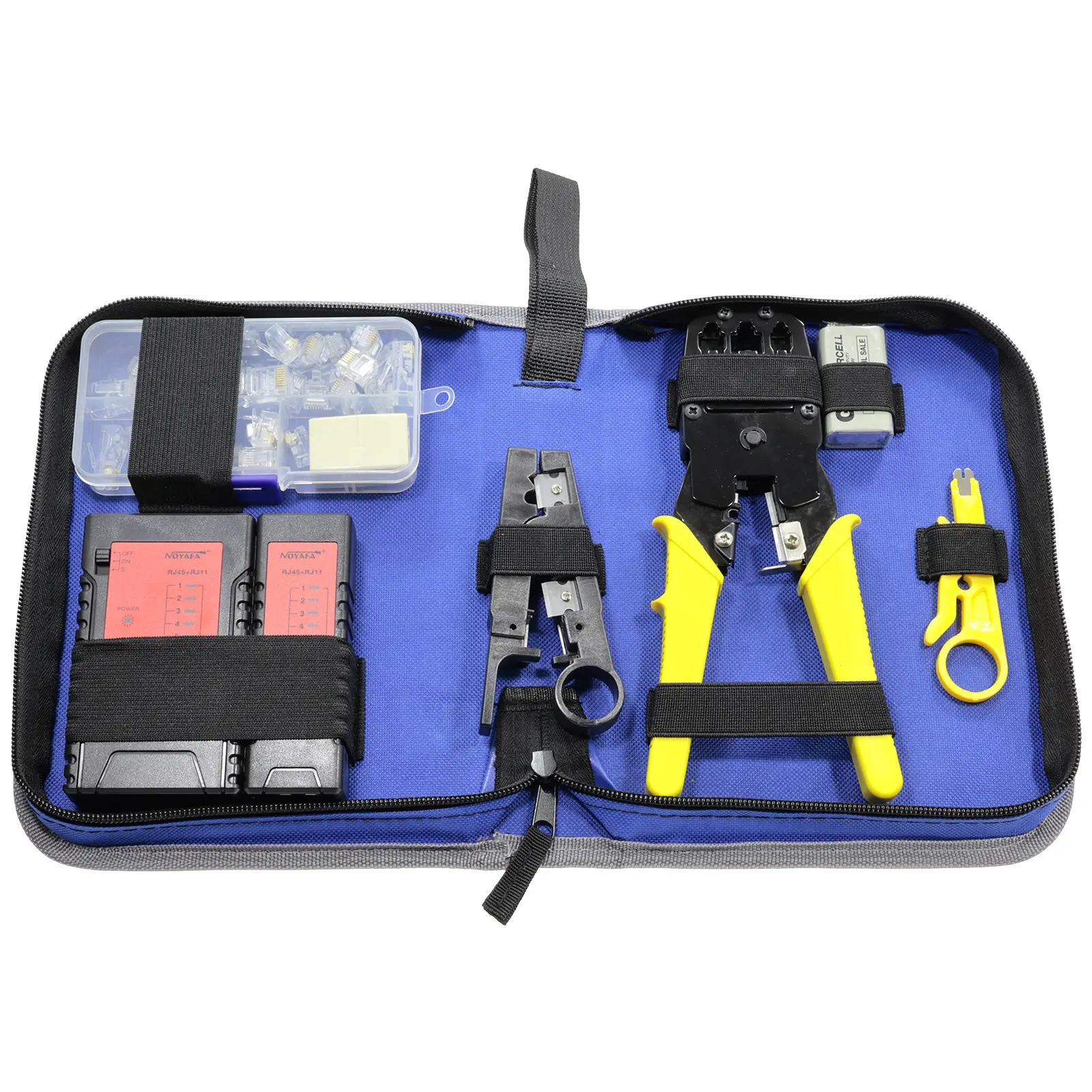 NOYAFA NF-1206 Network Cable Repair Toolkit to kompletny zestaw narzędzi sieciowych przeznaczony do montażu, testowania i naprawy kabli sieciowych RJ45 oraz telefonicznych RJ11. Zestaw znajduje zastosowanie w instalacjach LAN, pracach serwisowych, okablowaniu strukturalnym oraz bieżącej diagnostyce połączeń. Dzięki połączeniu testera kabli, zaciskarki, ściągaczy izolacji i akcesoriów montażowych umożliwia samodzielne przygotowanie i weryfikację przewodów w jednym, poręcznym komplecie.