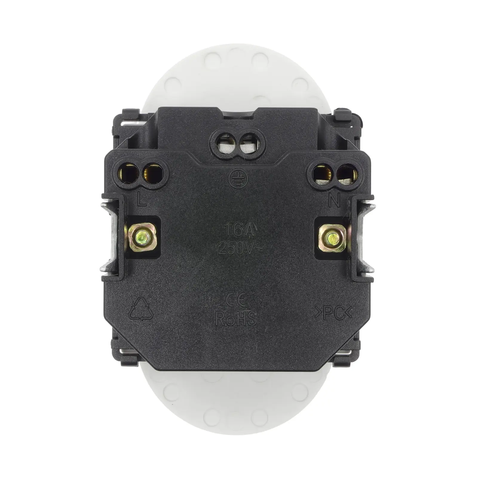 - Montaż modułu – wprowadź moduł gniazda do metalowej ramki, która jest w komplecie z ramką szklaną. Uwaga: oznaczenie "CE RoHS" ma być od strony ściany. Moduł zamontuj z wyczuciem na wcisk. Prawidłowo zamontowany moduł w metalowej ramce tworzy z nią stabilną całość.