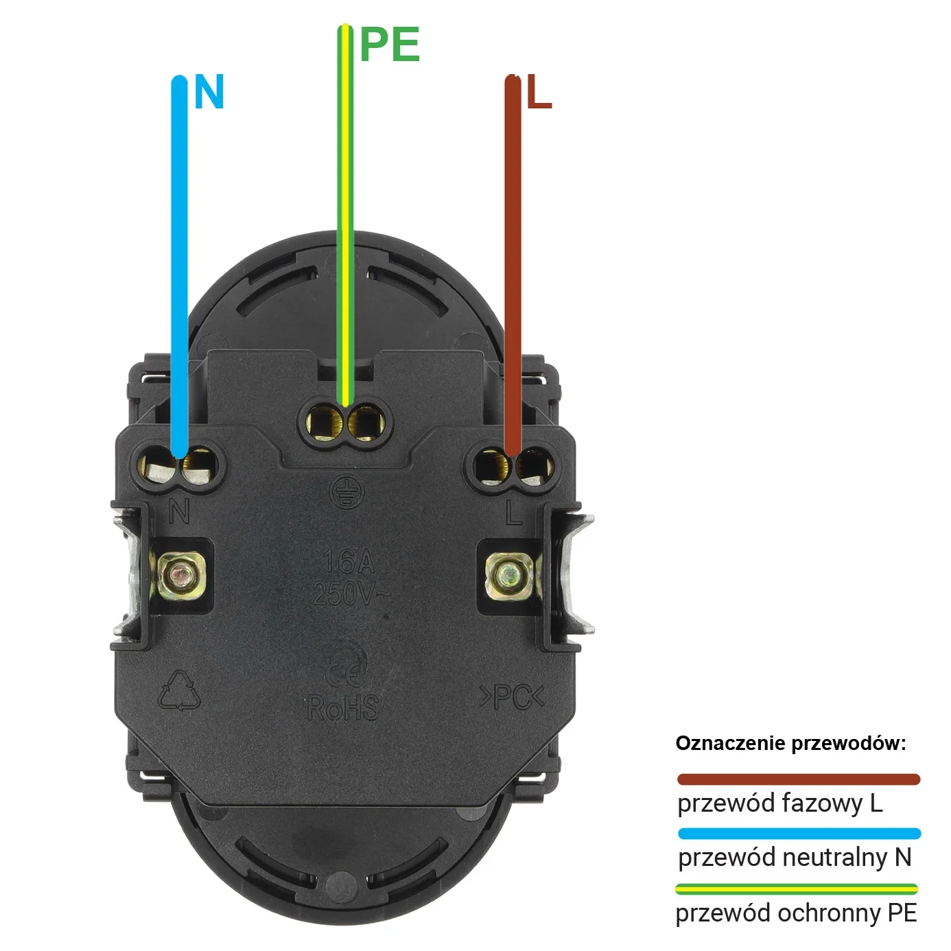 - Produkt: moduł bryzgoszczelnego gniazda z uziemieniem typu SCHUKO z klapką, podtynkowy