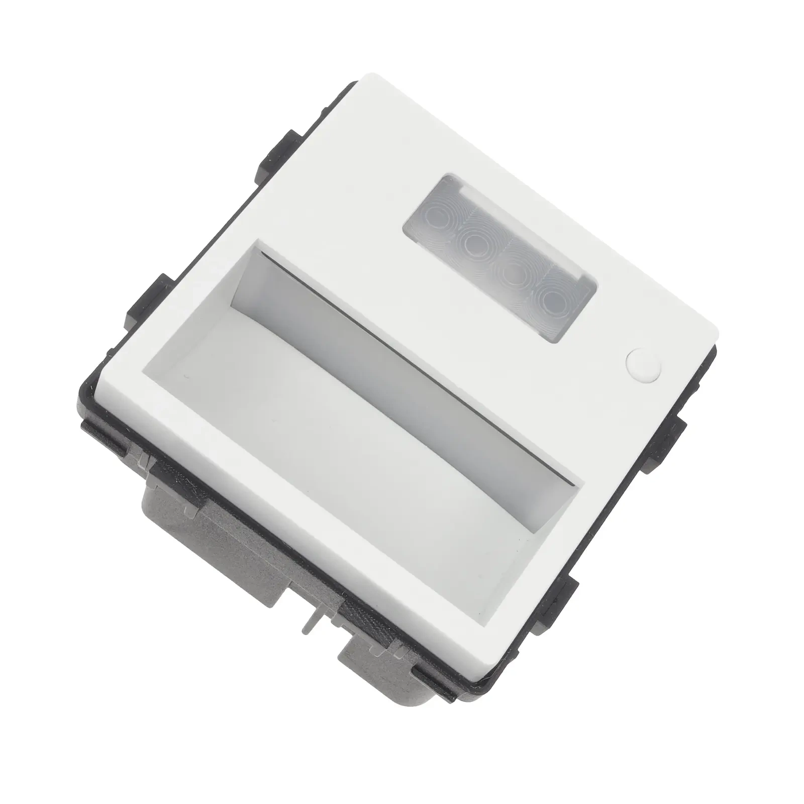- Montaż modułu – wprowadź moduł lampki do metalowej ramki, która jest w komplecie z ramką szklaną. Uwaga: oznaczenie "CE RoHS" ma być od strony ściany. Moduł zamontuj z wyczuciem na wcisk. Prawidłowo zamontowany moduł w metalowej ramce tworzy z nią stabilną całość.