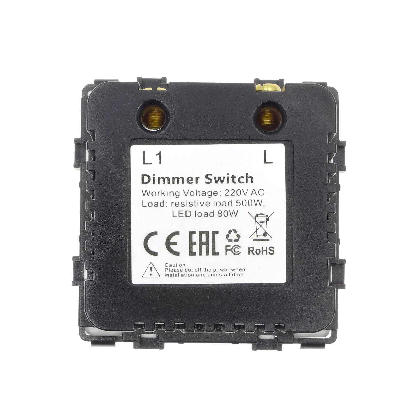 - Montaż modułu – wprowadź moduł dimmera do metalowej ramki, która jest w komplecie z ramką szklaną. Uwaga: oznaczenie "CE RoHS" ma być od strony ściany. Moduł zamontuj z wyczuciem na wcisk. Prawidłowo zamontowany moduł w metalowej ramce tworzy z nią stabilną całość.