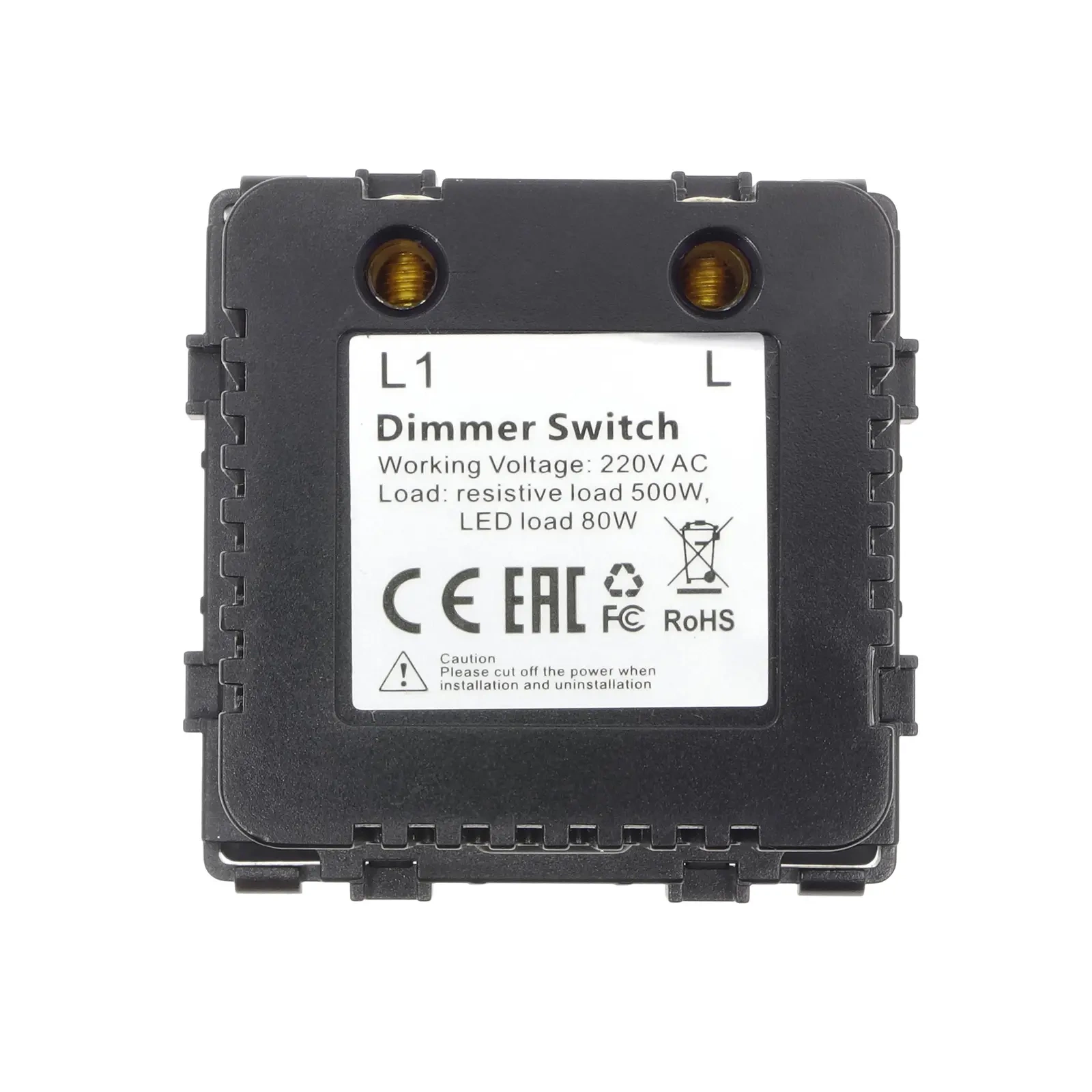 - Montaż modułu – wprowadź moduł dimmera do metalowej ramki, która jest w komplecie z ramką szklaną. Uwaga: oznaczenie "CE RoHS" ma być od strony ściany. Moduł zamontuj z wyczuciem na wcisk. Prawidłowo zamontowany moduł w metalowej ramce tworzy z nią stabilną całość.
