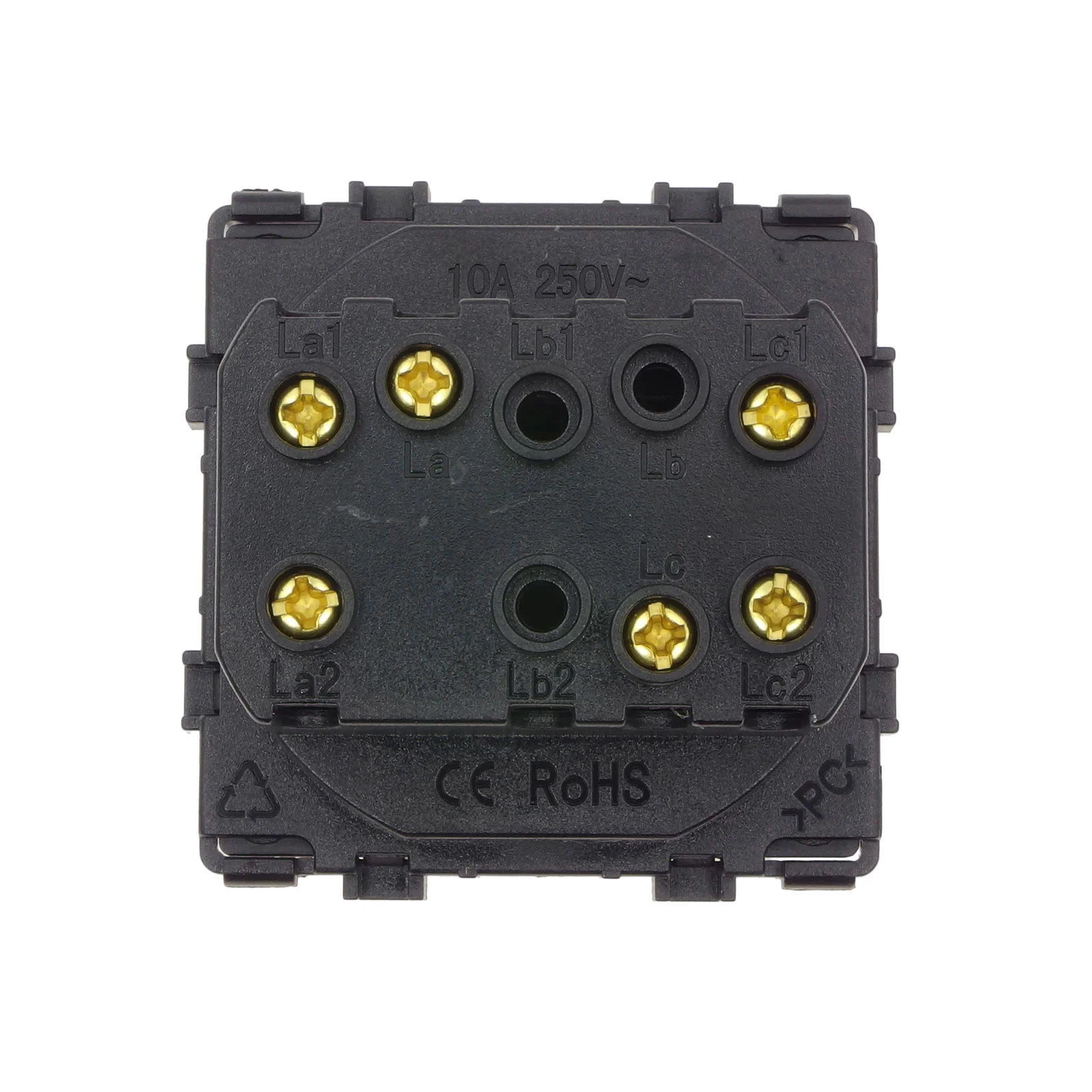 - Montaż modułu – wprowadź moduł włącznika do metalowej ramki, która jest w komplecie z ramką szklaną. Uwaga: oznaczenie "CE RoHS" ma być od strony ściany. Moduł zamontuj z wyczuciem na wcisk. Prawidłowo zamontowany moduł w metalowej ramce tworzy z nią stabilną całość.