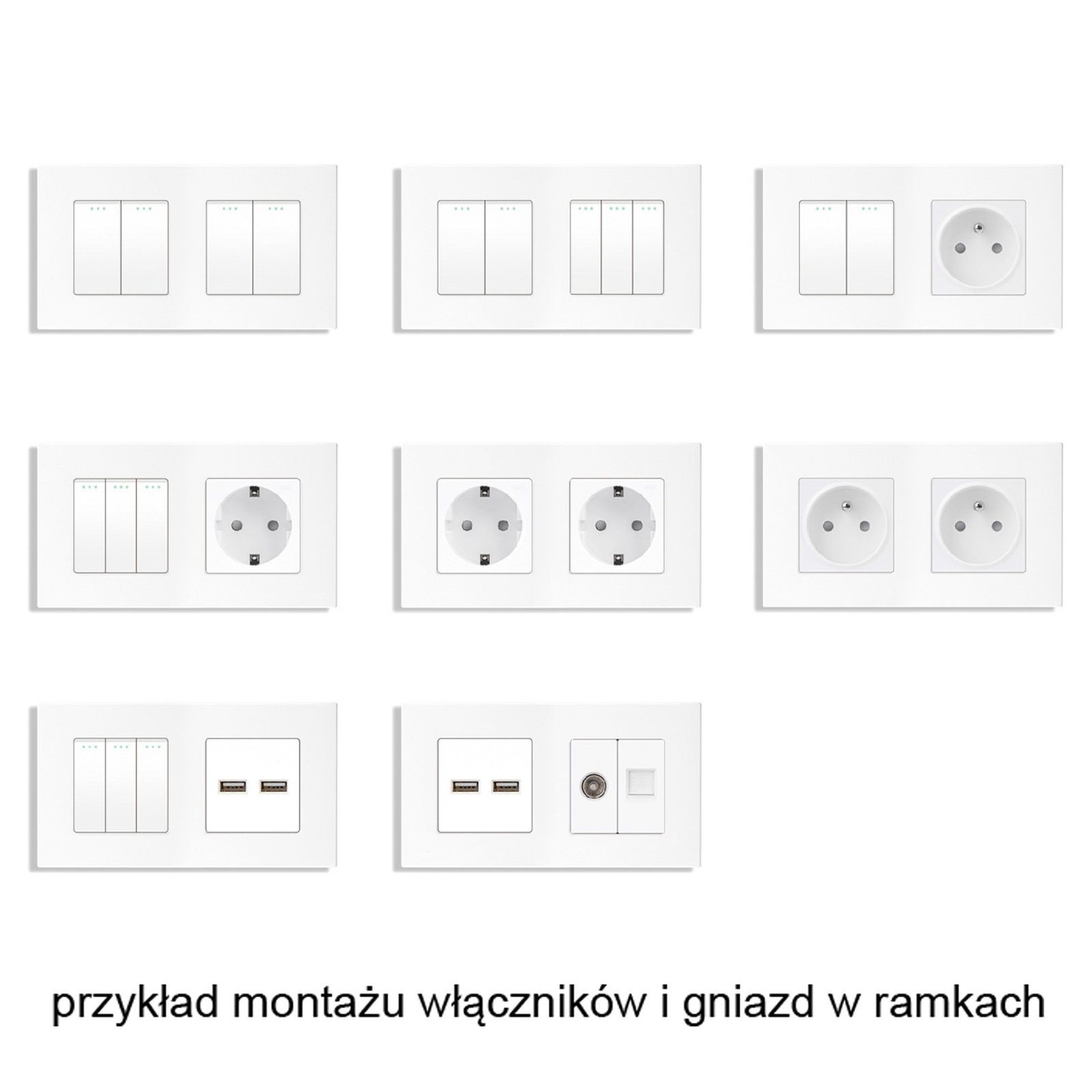 Moduł włącznika tworzy kompletny włącznik po połączeniu z ramką ze szkła hartowanego, dostępną w naszej ofercie serii TAWOIA Glass. Moduły można połączyć z ramką pojedynczą, podwójną, potrójną, poczwórną lub pięciokrotną. W ramkach wielokrotnych (podwójnych, potrójnych, poczwórnych, pięciokrotnych) można łączyć ten moduł z innymi modułami włączników i gniazdek.