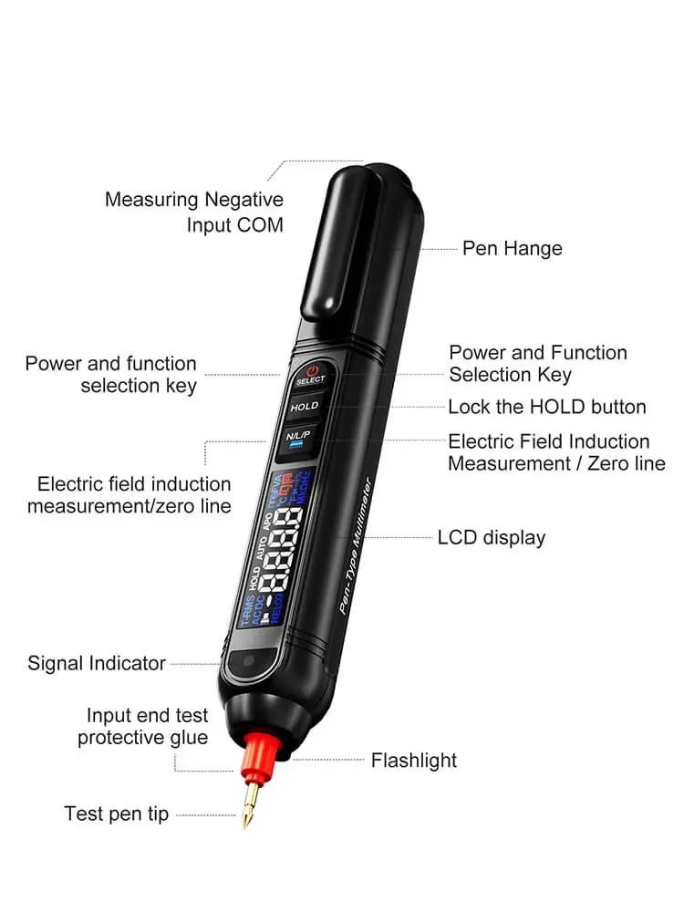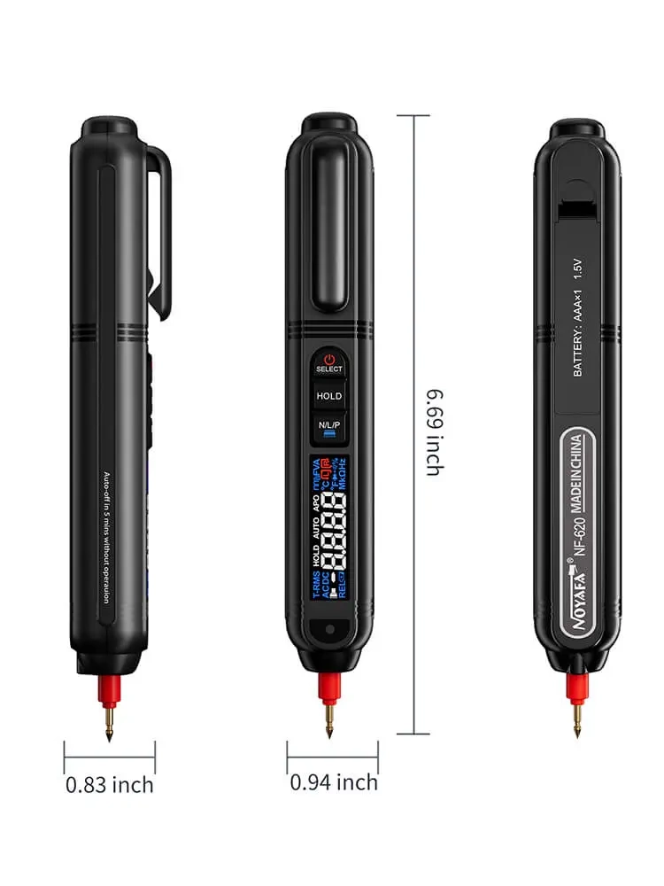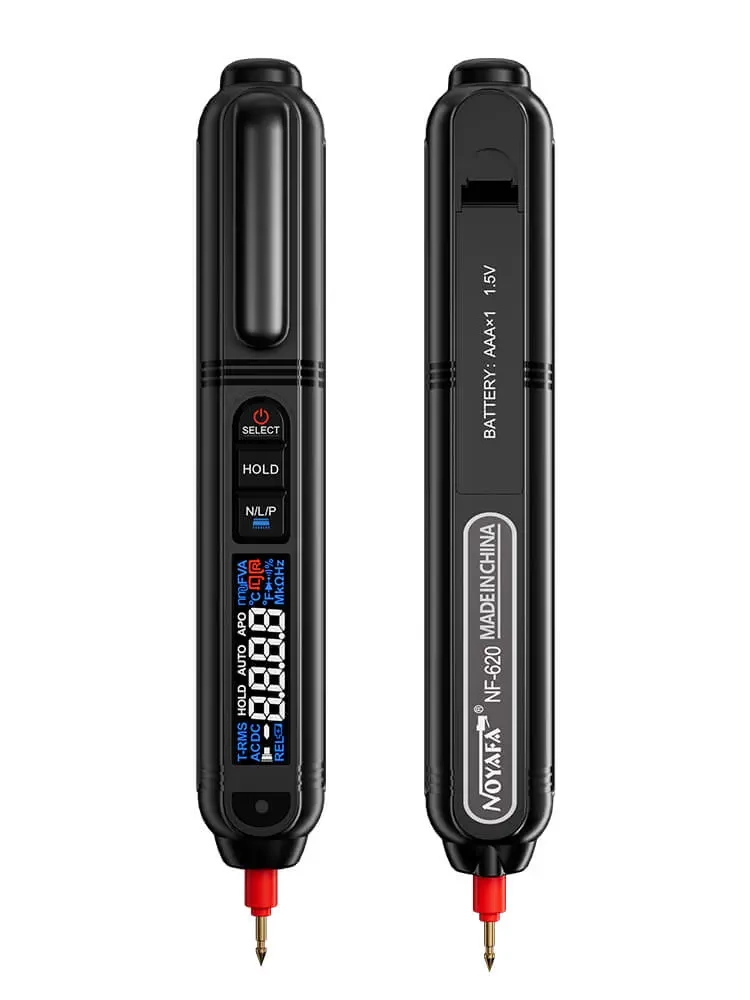 NOYAFA NF-620 Smart Pen Multimeter to kompaktowy multimetr cyfrowy w formie poręcznego długopisu, zaprojektowany dla elektryków, instalatorów i hobbystów. Łączy w sobie funkcje kilku urządzeń, oferując szeroki zakres testów: napięcie, rezystancję, ciągłość, pojemność oraz bezkontaktową detekcję przewodów pod napięciem (NCV).