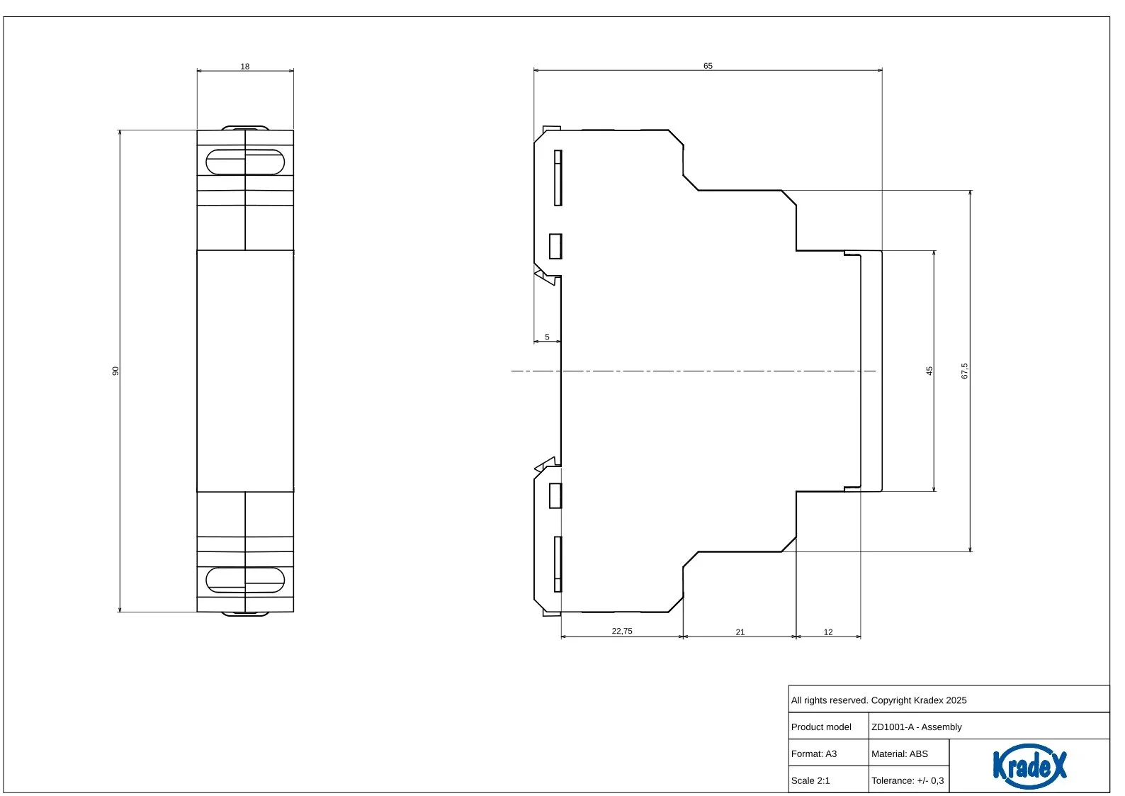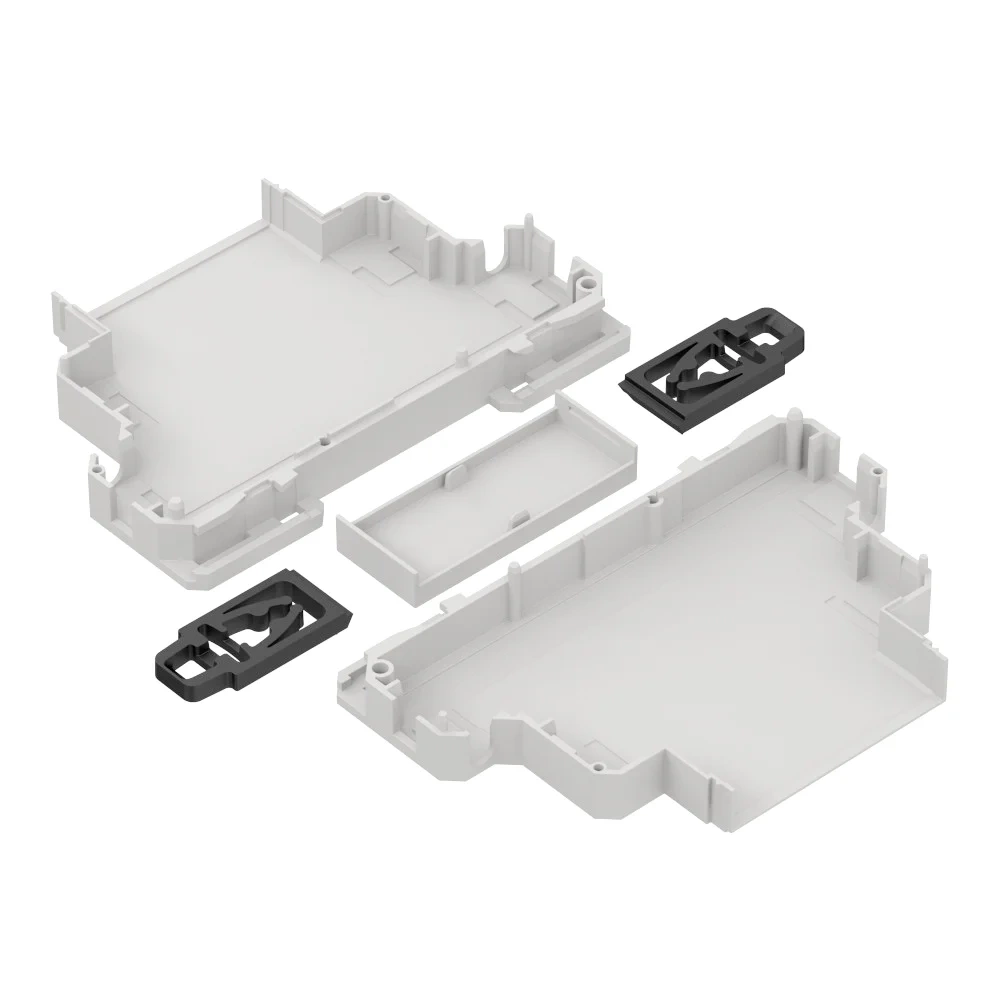 - Zestaw zawiera: dolną i górną część obudowy oraz klipsy do montażu na szynie DIN