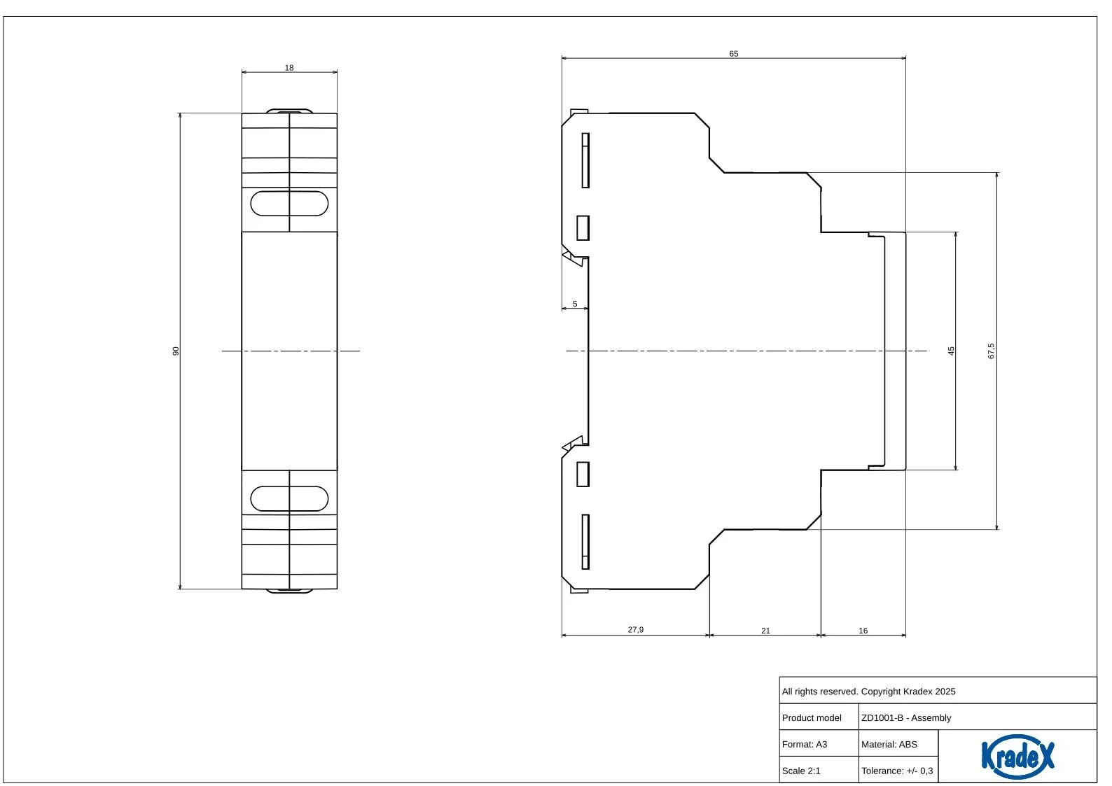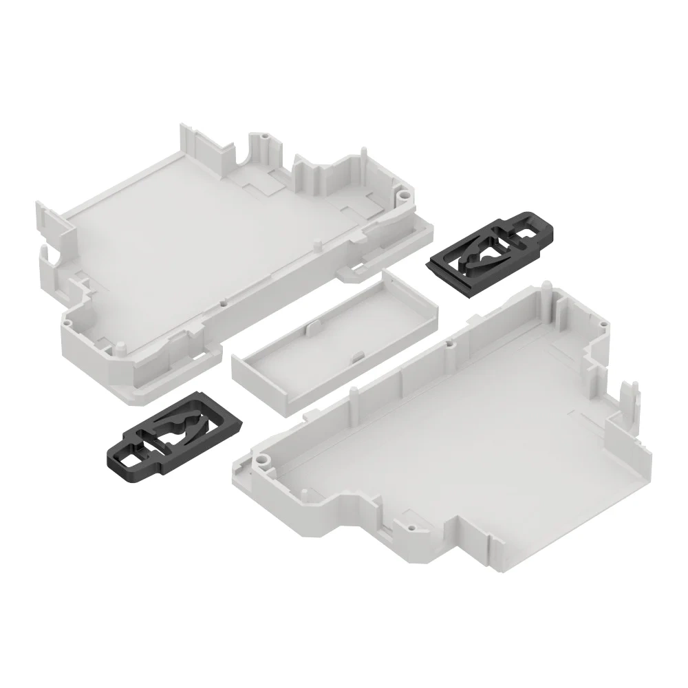 - Zestaw zawiera: dolną i górną część obudowy oraz klipsy do montażu na szynie DIN
