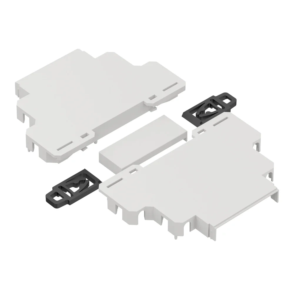 - Zestaw zawiera: dolną i górną część obudowy oraz klipsy do montażu na szynie DIN