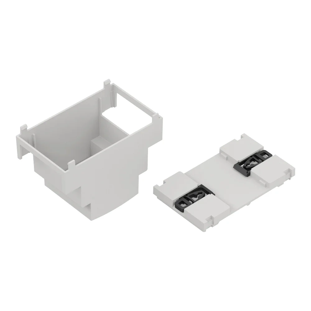 - Zestaw zawiera: dolną i górną część obudowy oraz klipsy do montażu na szynie DIN