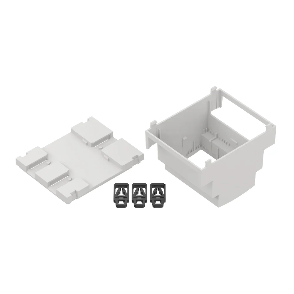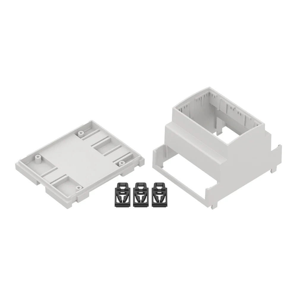 - Zestaw zawiera: dolną i górną część obudowy oraz klipsy do montażu na szynie DIN