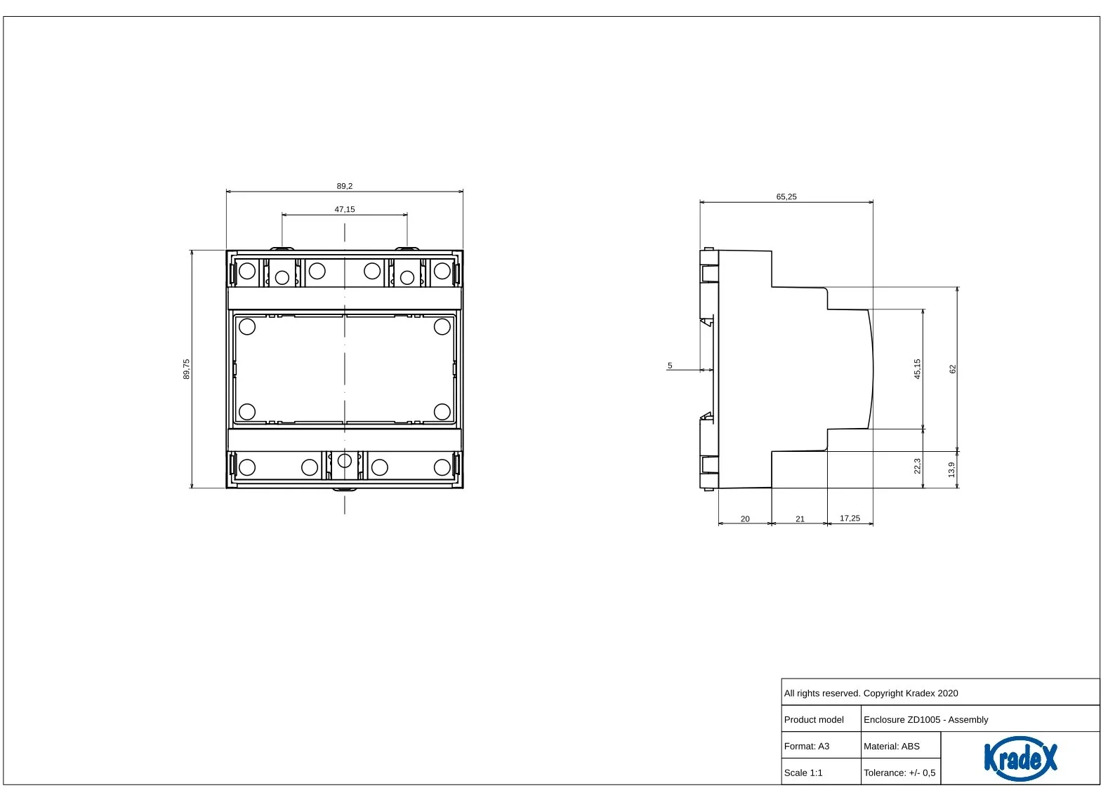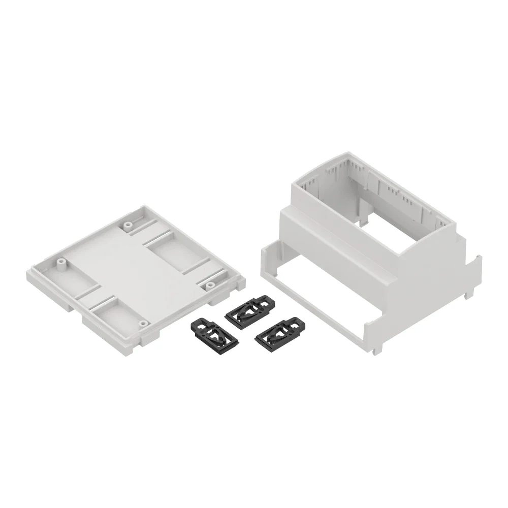 - Zestaw zawiera: dolną i górną część obudowy oraz klipsy do montażu na szynie DIN