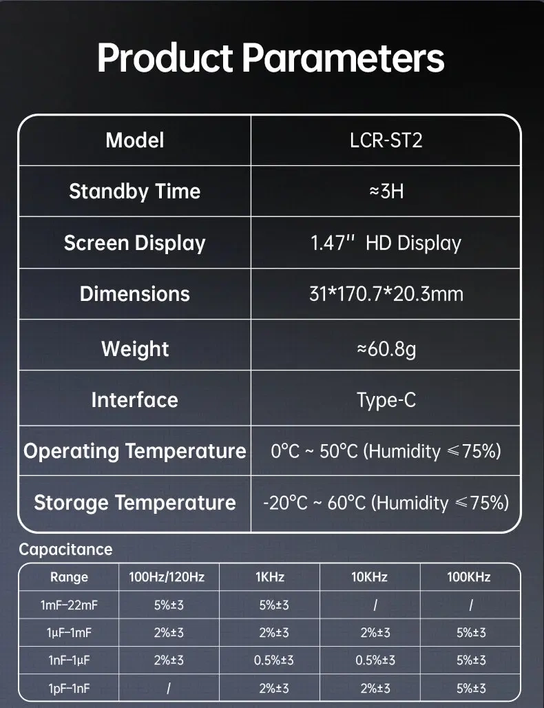LCR-ST2 wspiera pomiary dodatkowych parametrów: D/Q/Z/X/θ oraz ESR, a tryby szeregowy/równoległy (series/parallel equivalent) pomagają uzyskać realniejsze wyniki w zależności od typu elementu i częstotliwości testu. Funkcja sweep 100 Hz-100 kHz pozwala szybko sprawdzić, jak zmienia się element w funkcji częstotliwości (np. ESR kondensatora lub zachowanie cewki).