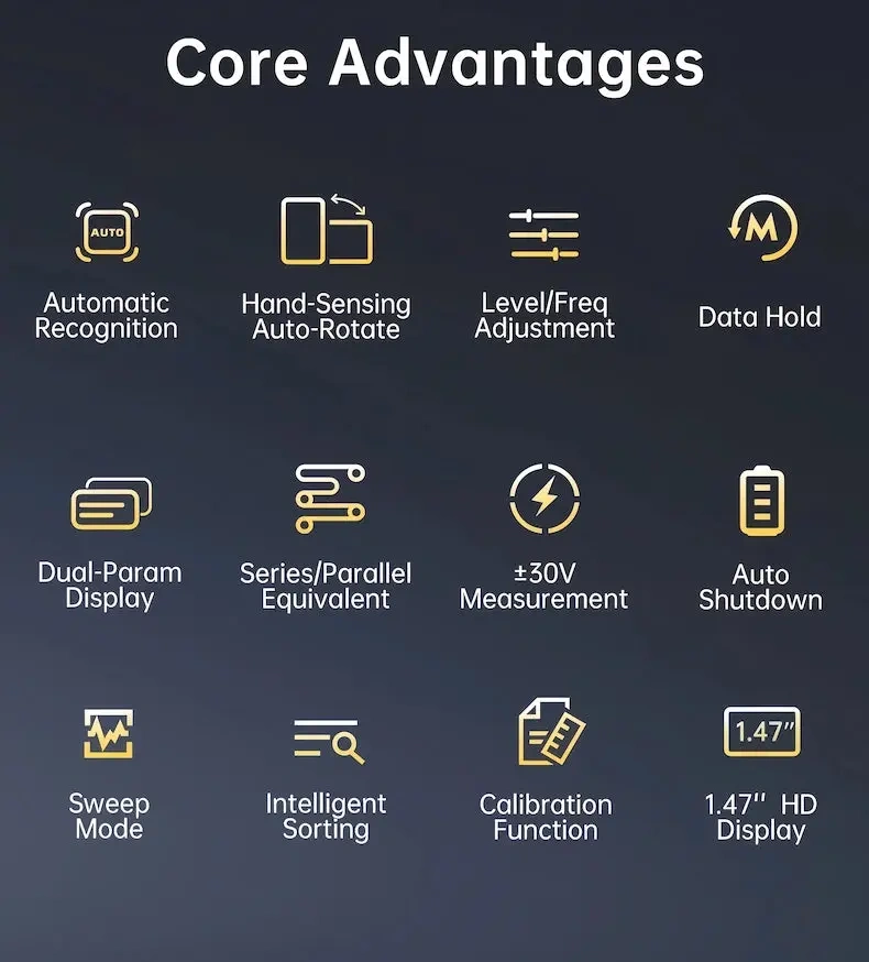 - Sortowanie OK/NG oszczędza czas: ustaw wartość nominalną i tolerancję, a miernik sam klasyfikuje elementy - świetne do selekcji kondensatorów i rezystorów przed montażem.