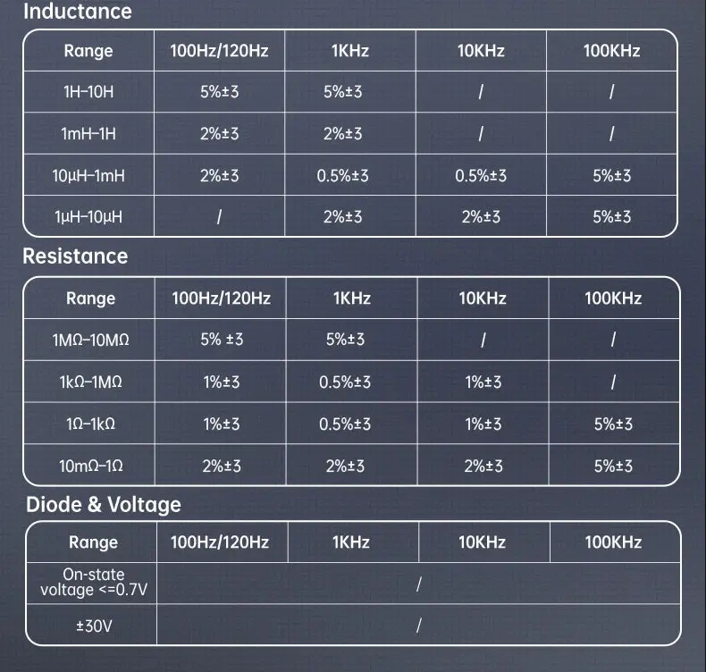 (Dokładność zależy od zakresu i częstotliwości - w praktyce dobór 1 kHz / 10 kHz daje najstabilniejsze wyniki dla większości elementów.)
