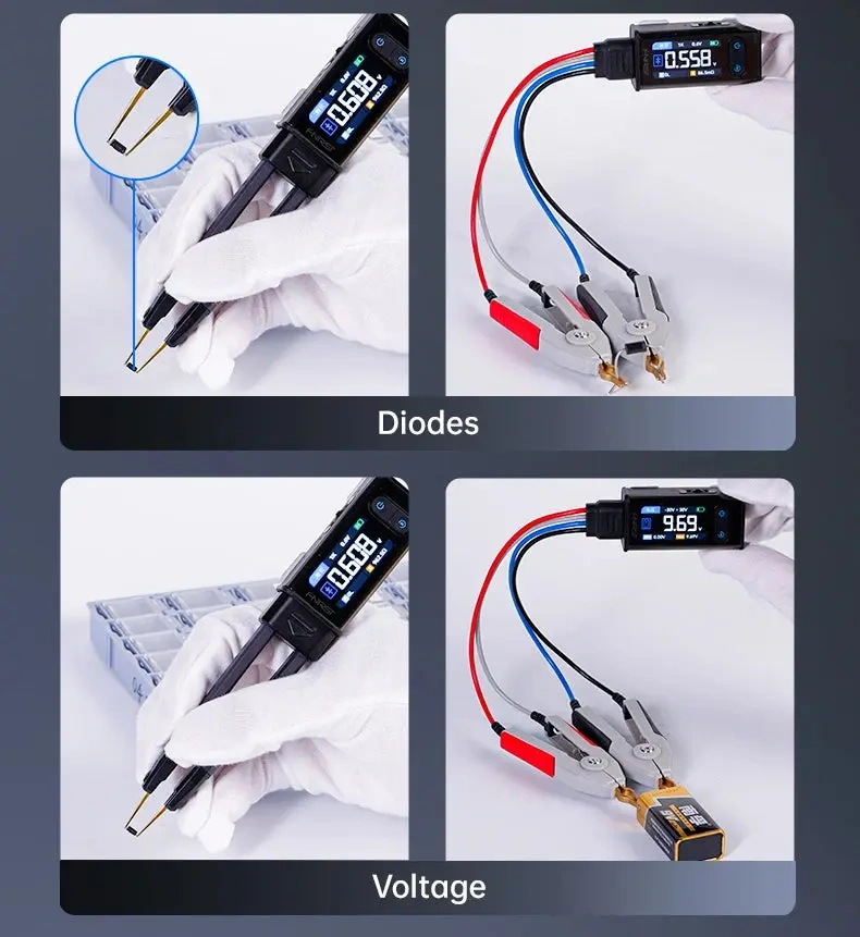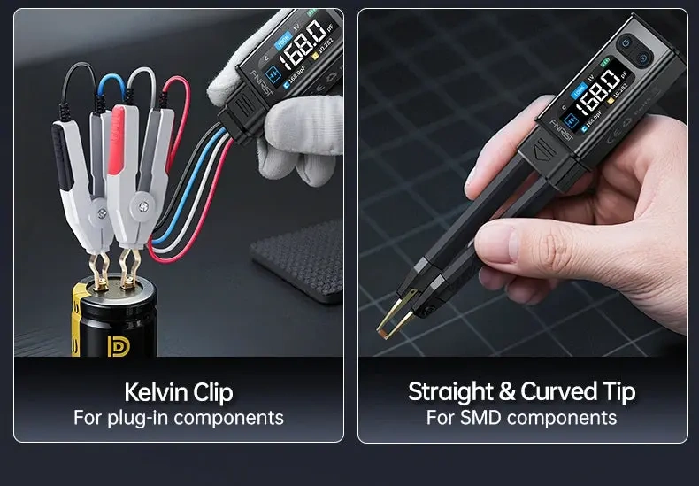 FNIRSI® LCR-ST2 to cyfrowa pęseta pomiarowa LCR/ESR (tzw. LCR tweezer), która łączy w jednej konstrukcji szybkie testowanie SMD oraz dokładniejszy pomiar metodą Kelvina (4-przewodową) przy użyciu dołączonego klipsa. Urządzenie służy do pomiaru rezystancji, pojemności, indukcyjności oraz ESR, a także do testu diod i pomiaru napięcia do ±30 V. To praktyczne narzędzie do serwisu elektroniki, kontroli jakości, selekcji elementów oraz pracy na stanowisku montażowym.