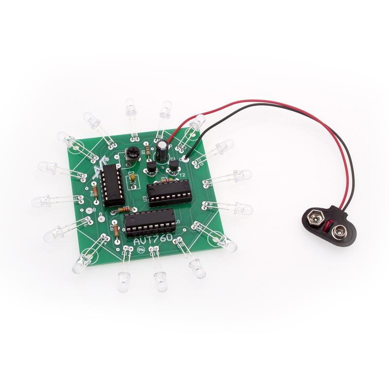 W prosty sposób uzyskano efektowne, obracające się światło - naśladują je przełączane sekwencyjnie diody LED. Układ emituje silne błyski światła i może być atrakcyjnym urozmaiceniem wielu spotkań towarzyskich.