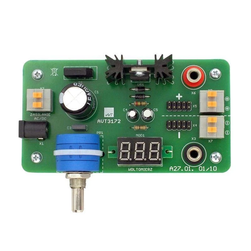 Praktyczny zasilacz warsztatowy jest przystawką do posiadanego zasilacza. Może to być zasilacz transformatorowy lub im-pulsowy. Elementem regulacyjnym jest doskonale znany stabilizator LM317. Dużym atutem oferowanej przystawki jest użycie potencjometru wieloobrotowego, Co pozwoli na precyzyjne ustawienie napięcia wyjściowego oraz wbudowany woltomierz z wyświetlaczem LED.