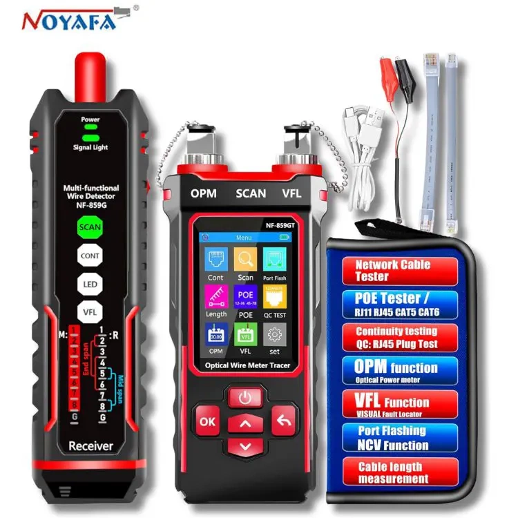 NOYAFA NF-859GT to kompletny, wielofunkcyjny tester okablowania dla instalatorów sieci Ethernet, telekomunikacji i światłowodów. Łączy w sobie aż 10 kluczowych funkcji diagnostycznych, umożliwiając testowanie mapy przewodów, pomiary długości, analizę PoE, lokalizację uszkodzeń w światłowodach (VFL), pomiar mocy optycznej (OPM), testowanie zarobienia złączy RJ11/RJ45, wykrywanie napięcia NCV oraz szybkie wyszukiwanie portów w switchach. Dzięki temu znacząco skraca czas instalacji i serwisu oraz zwiększa niezawodność całej infrastruktury sieciowej.