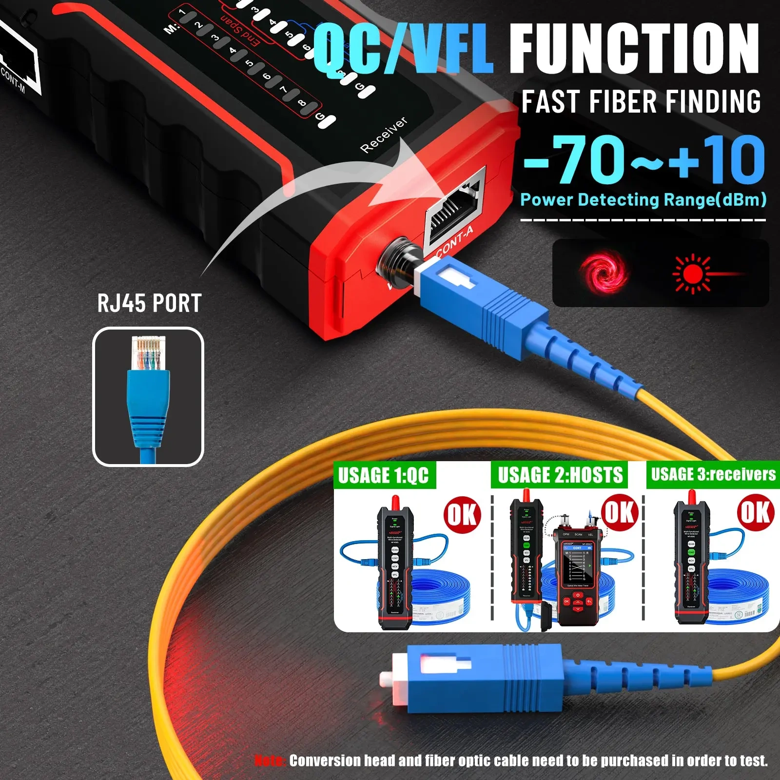 Tester obsługuje najpopularniejsze rodzaje okablowania: RJ11, RJ45, CAT5e/CAT6/CAT6a, linie telefoniczne, włókna światłowodowe oraz inne kable stosowane w sieciach teleinformatycznych. Pozwala to na uniwersalne wykorzystanie jednego narzędzia przy instalacjach mieszanych.