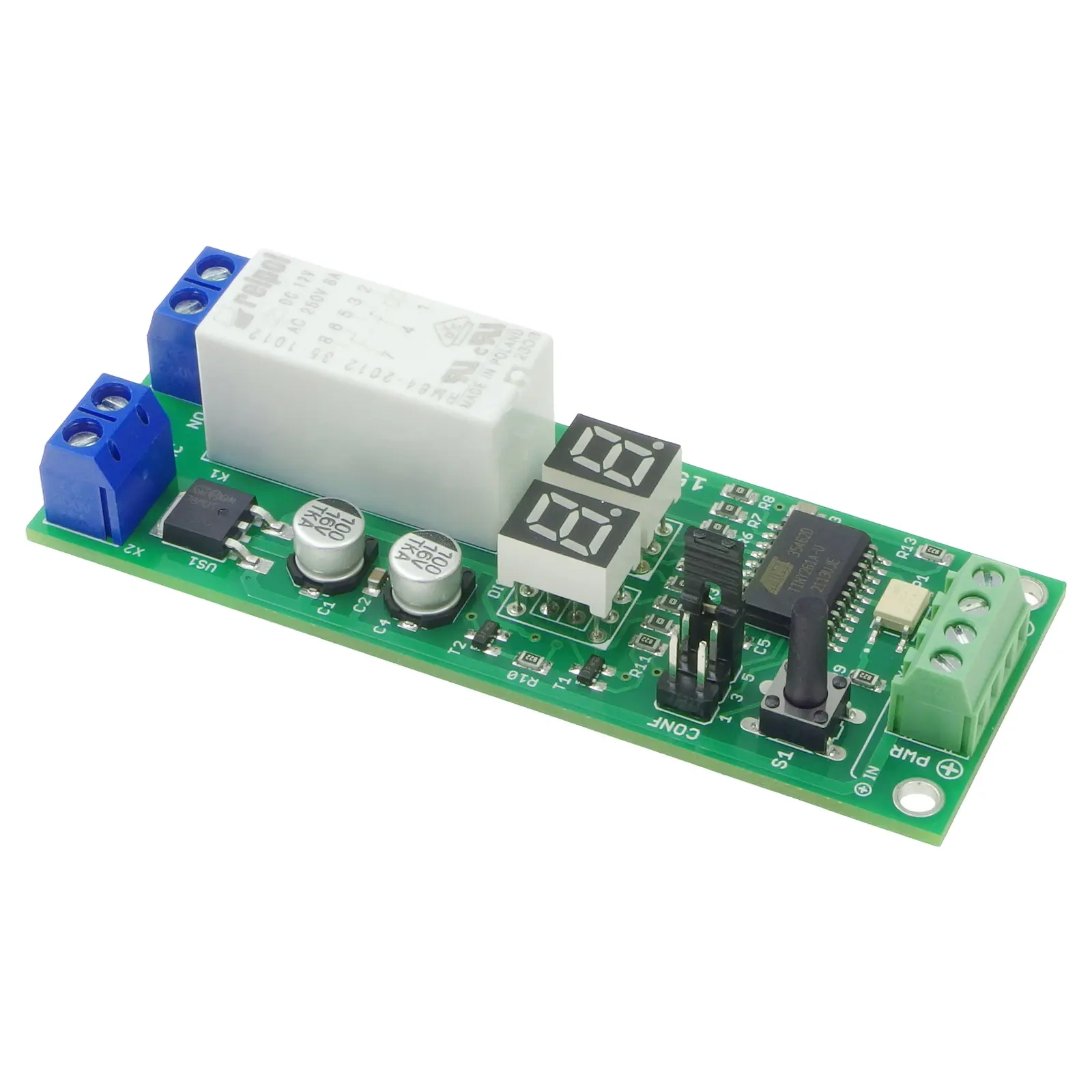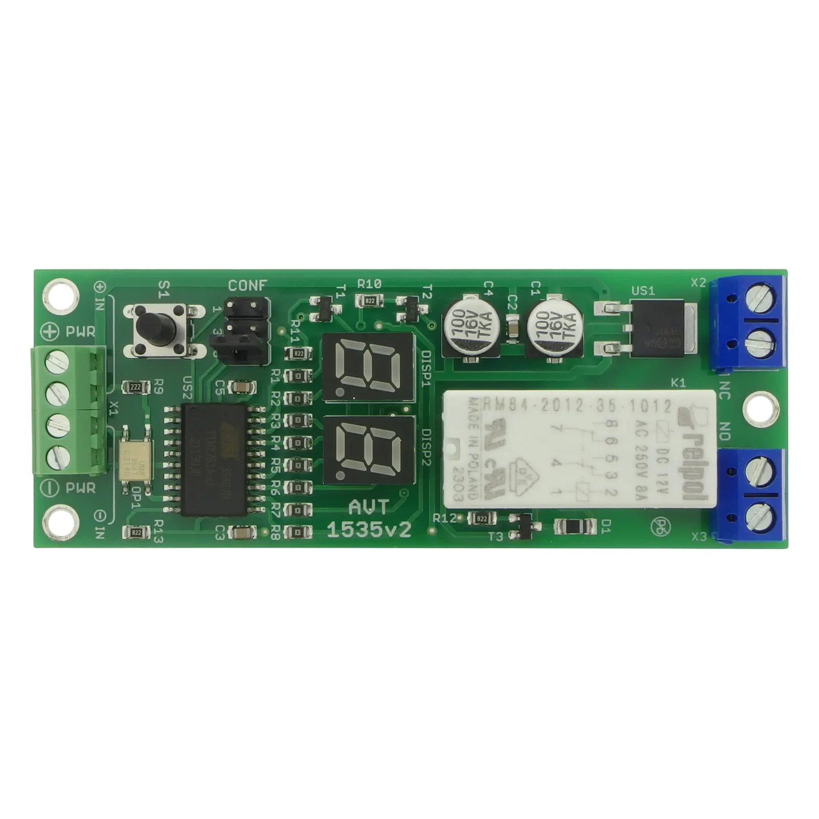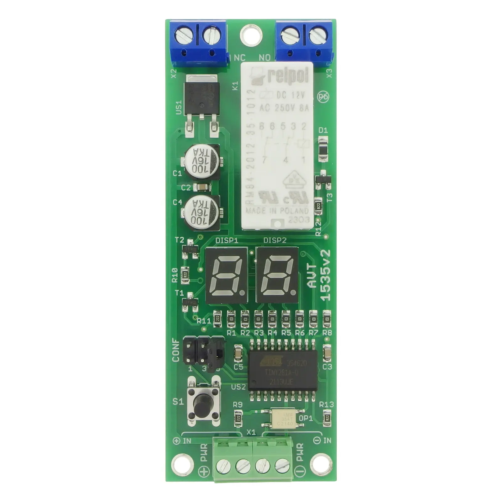 Układ jest przekaźnikowym, Czasowym modułem wykonawczym wyposażonym w kilka praktycznych funkcji: cztery tryby pracy, zakres nastawy czasu 1…99 s, wyjścia NO i NC, wejście sterujące z separacją galwaniczną, wyświetlacz LED - dwie cyfry.
