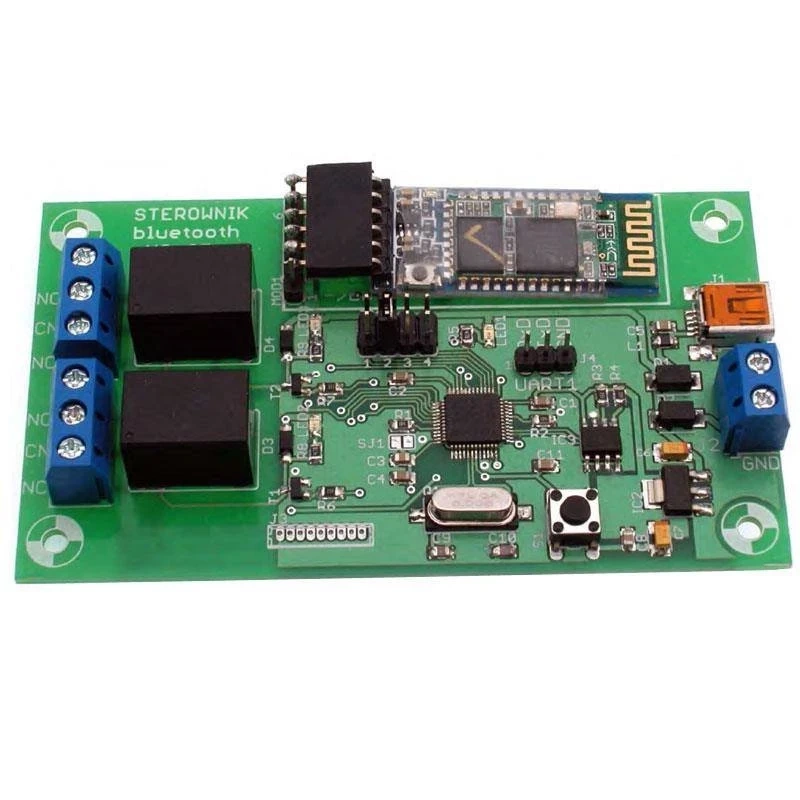 Zdalnie sterowany przełącznik z dwoma przekaźnikami. Ponieważ do sterowania użyto interfejsu Bluetooth, przełącznikiem można sterować za pośrednictwem komputera, tabletu lub smartfona. Komendy sterujące włączeniem i wyłączeniem przekaźników mają format tekstowy. Do obsługi przełącznika napisano specjalną androidową aplikację, jednak do wysyłania komend można wykorzystać dowolny program terminalu. Każdy z przekaźników można włączyć na stałe lub na zaprogramowany czas.