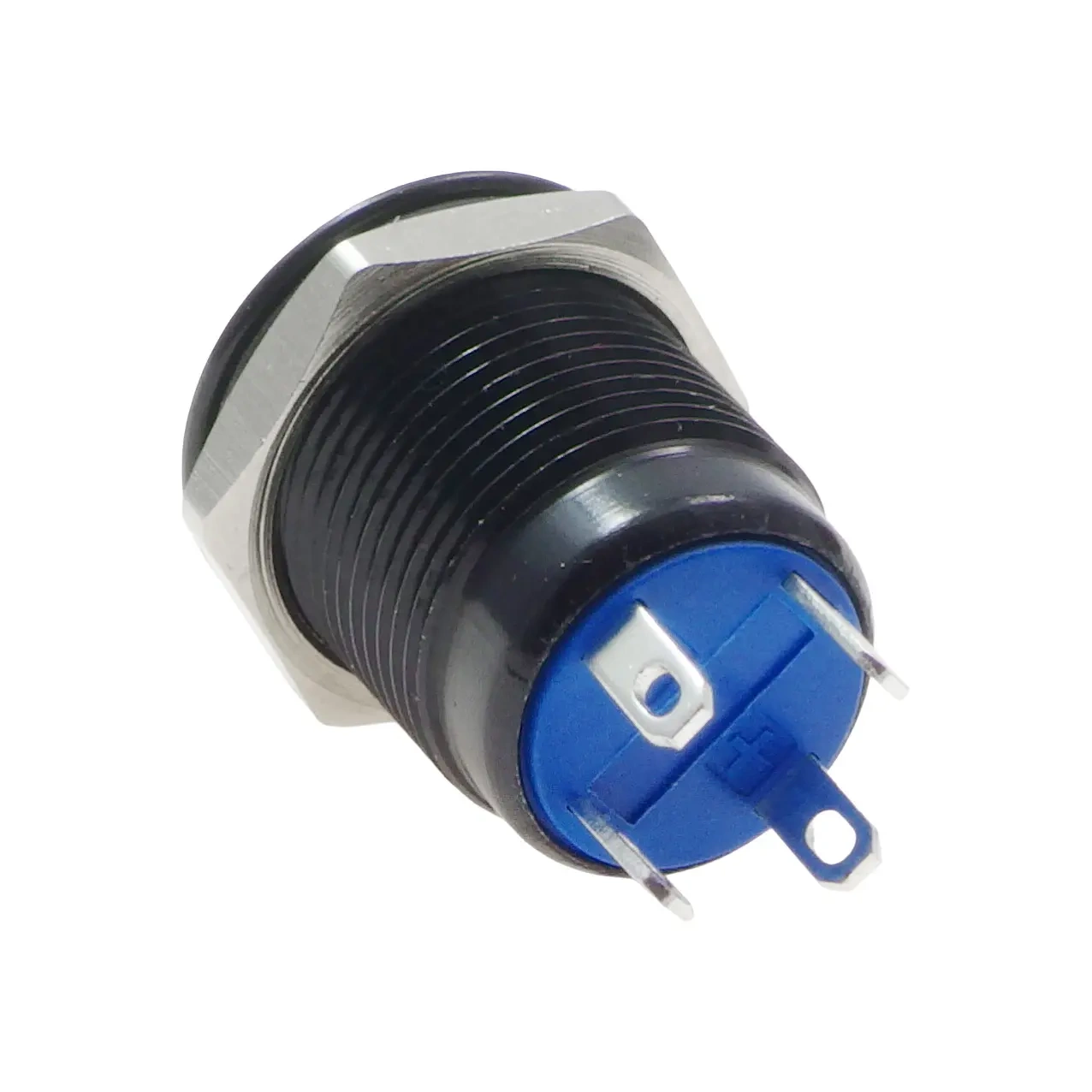 - Typ działania: chwilowy (momentary), konfiguracja SPST (1NO), przycisk włącza się po naciśnięciu i wyłącza po puszczeniu