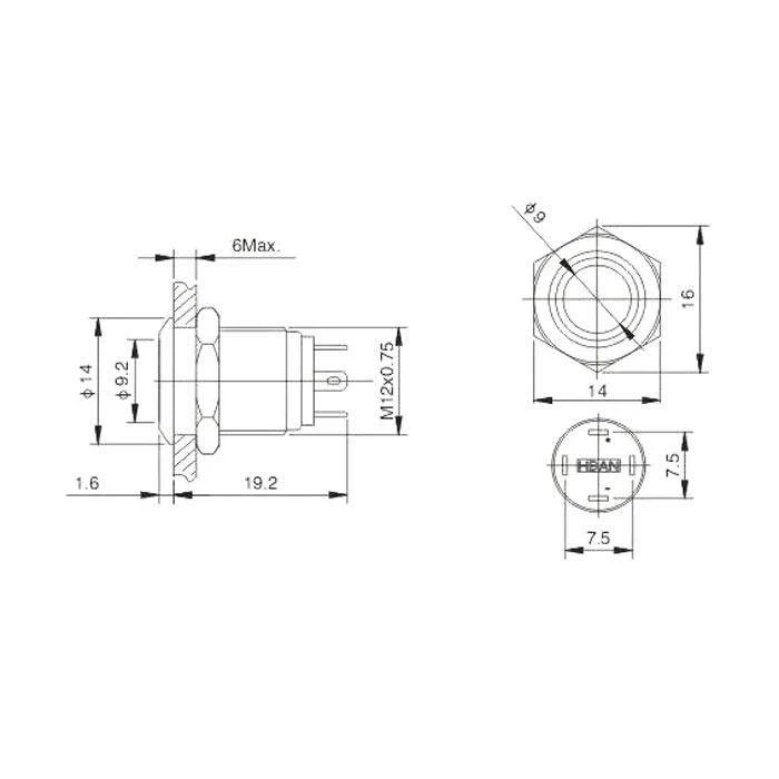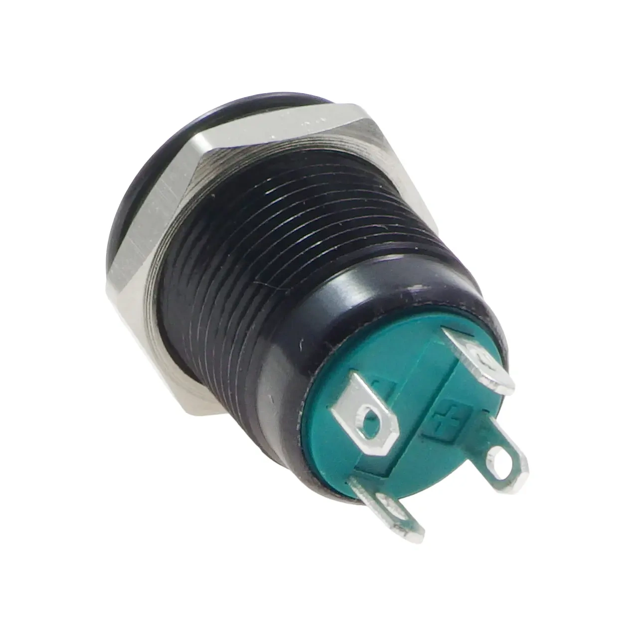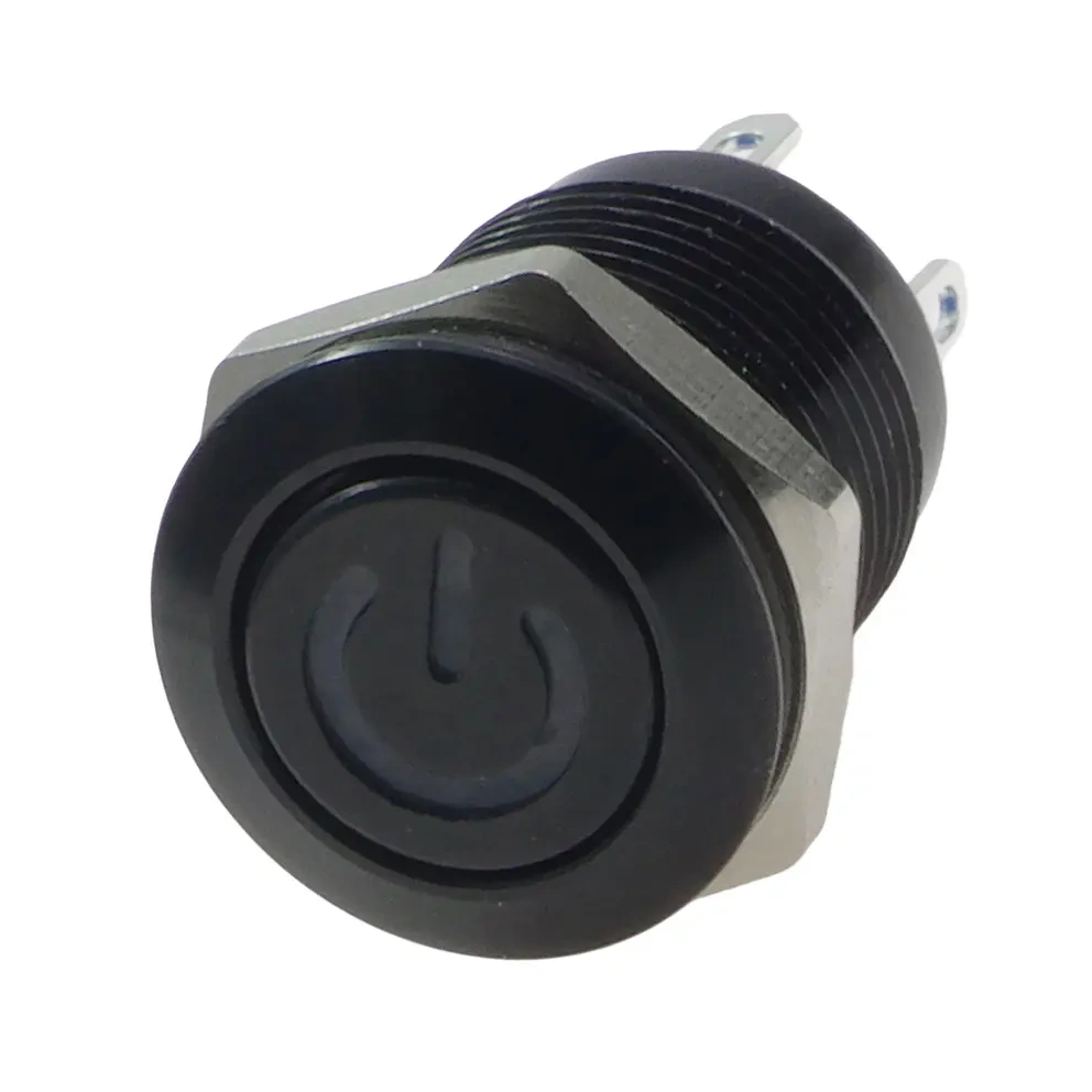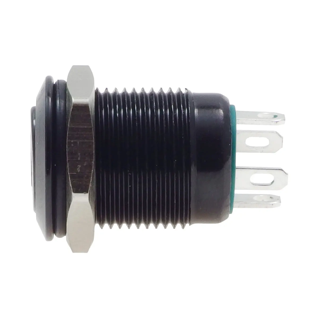 - Typ działania: chwilowy (momentary), konfiguracja SPST (1NO), przycisk włącza się po naciśnięciu i wyłącza po puszczeniu