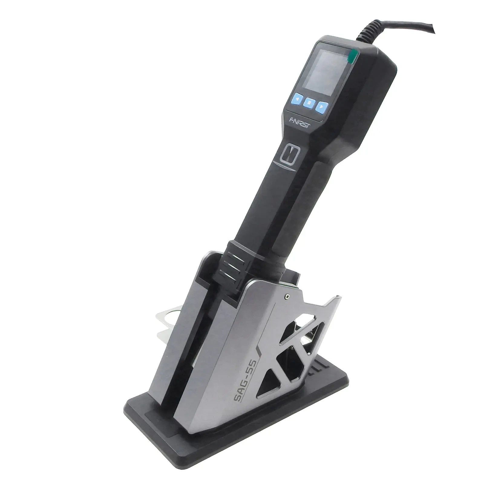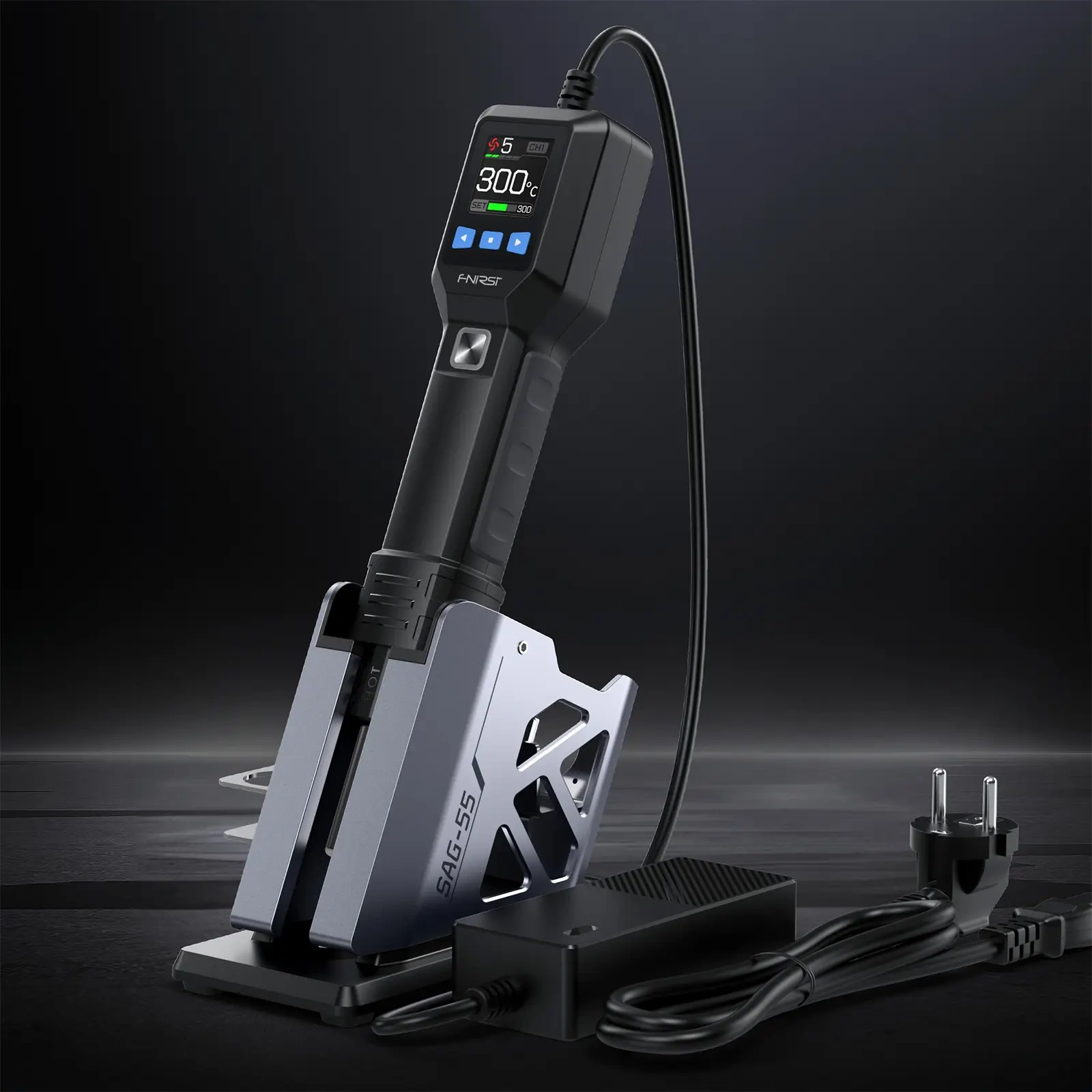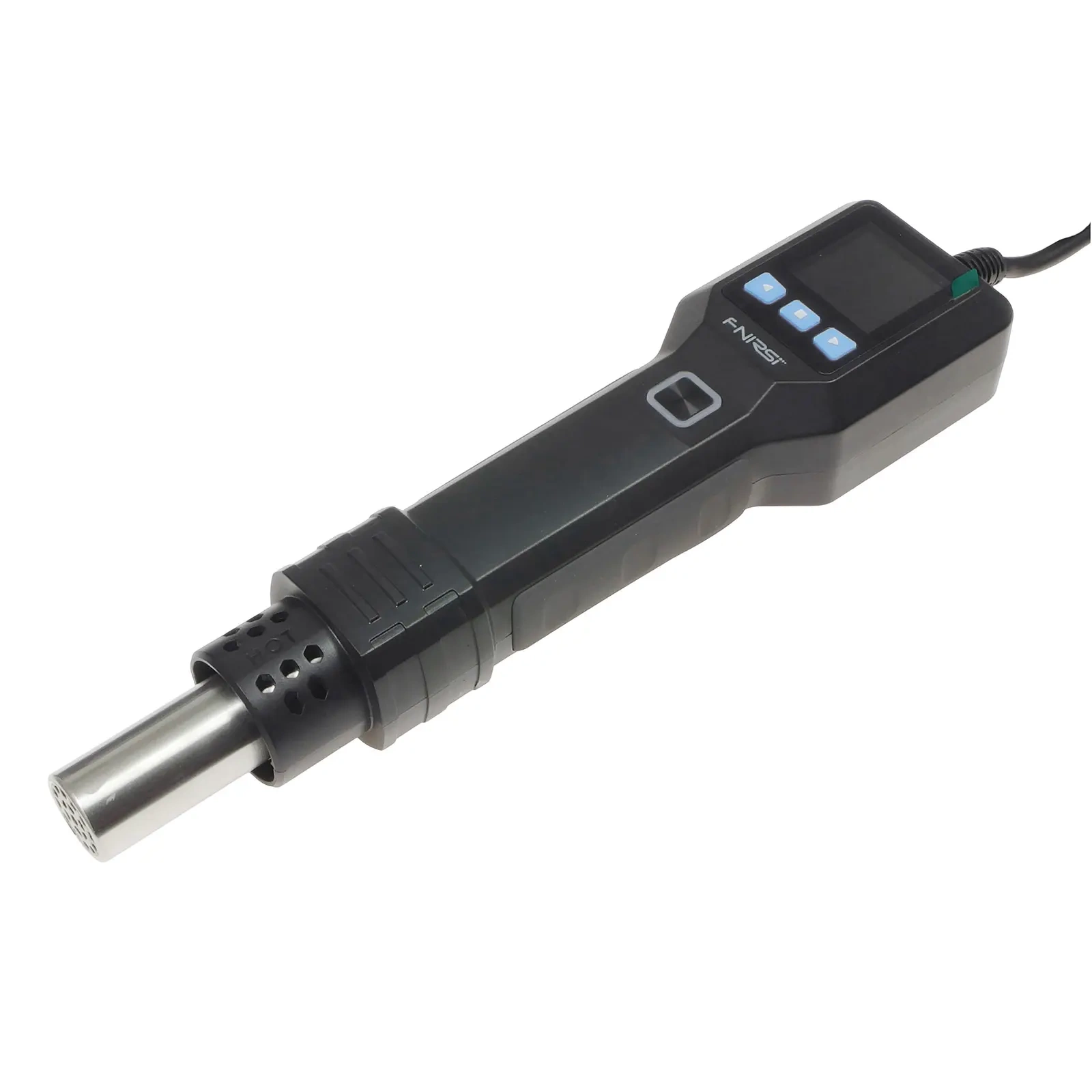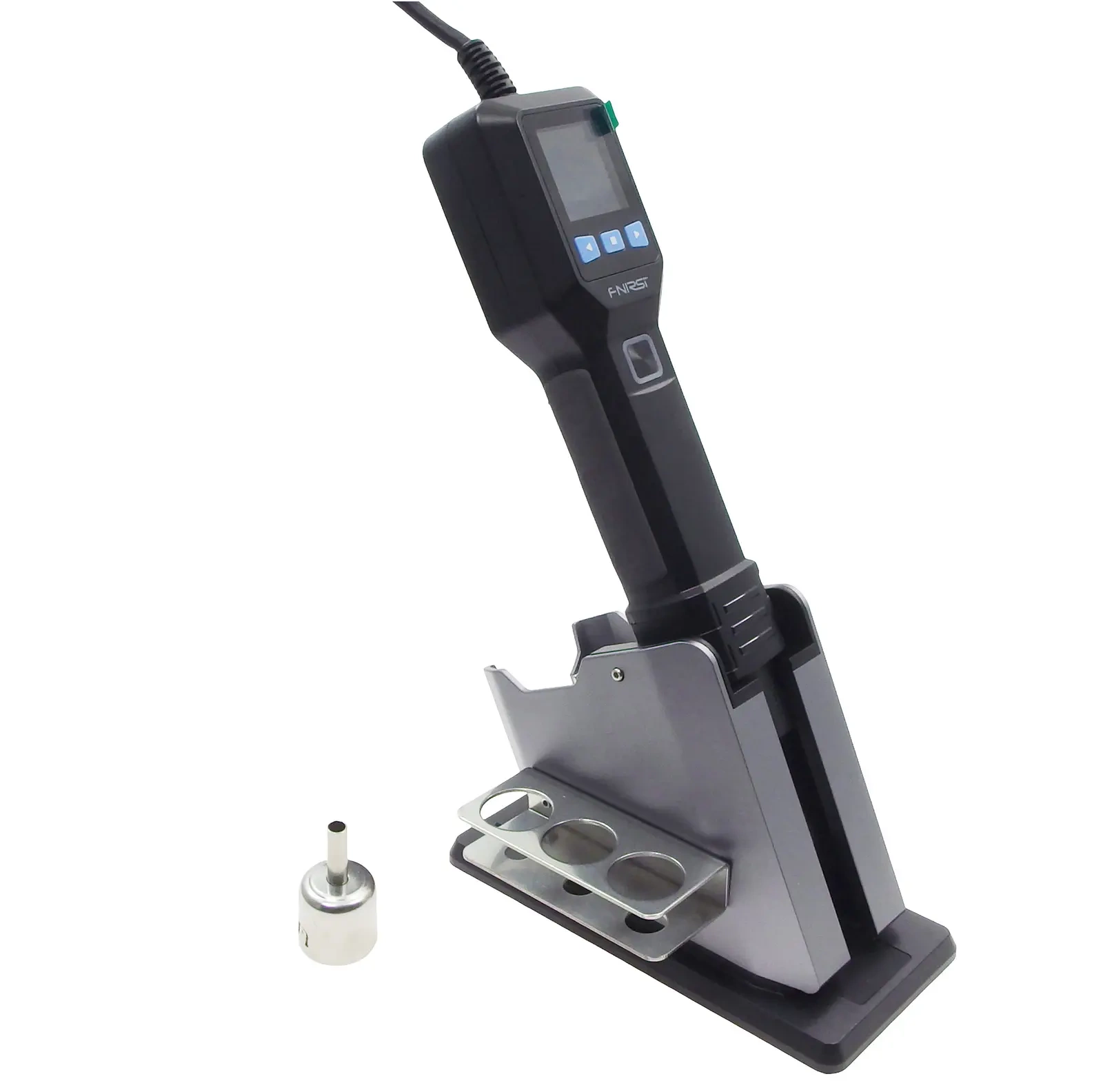 Uchwyt zawiera czujnik magnetyczny, który automatycznie nagrzewa się po podniesieniu i chłodzi po odłożeniu. Kontroler i ekran wyświetlacza na uchwycie umożliwiają łatwą, jednoręczną regulację temperatury i prędkości wiatru. Obsługuje również trzy zestawy szybkich ustawień temperatury/prędkości wiatru do szybkiego przełączania. Funkcja szybkiego chłodzenia przyspiesza chłodzenie, dodatkowo wydłużając żywotność elementu grzejnego. Monitorowanie w czasie rzeczywistym przez różne czujniki zapewnia wyłączenie ogrzewania w przypadku jakichkolwiek nieprawidłowości, zapewniając bezpieczeństwo. Wyświetlacz LCD i wskaźnik LED wyraźnie pokazują status pracy i zmiany temperatury.