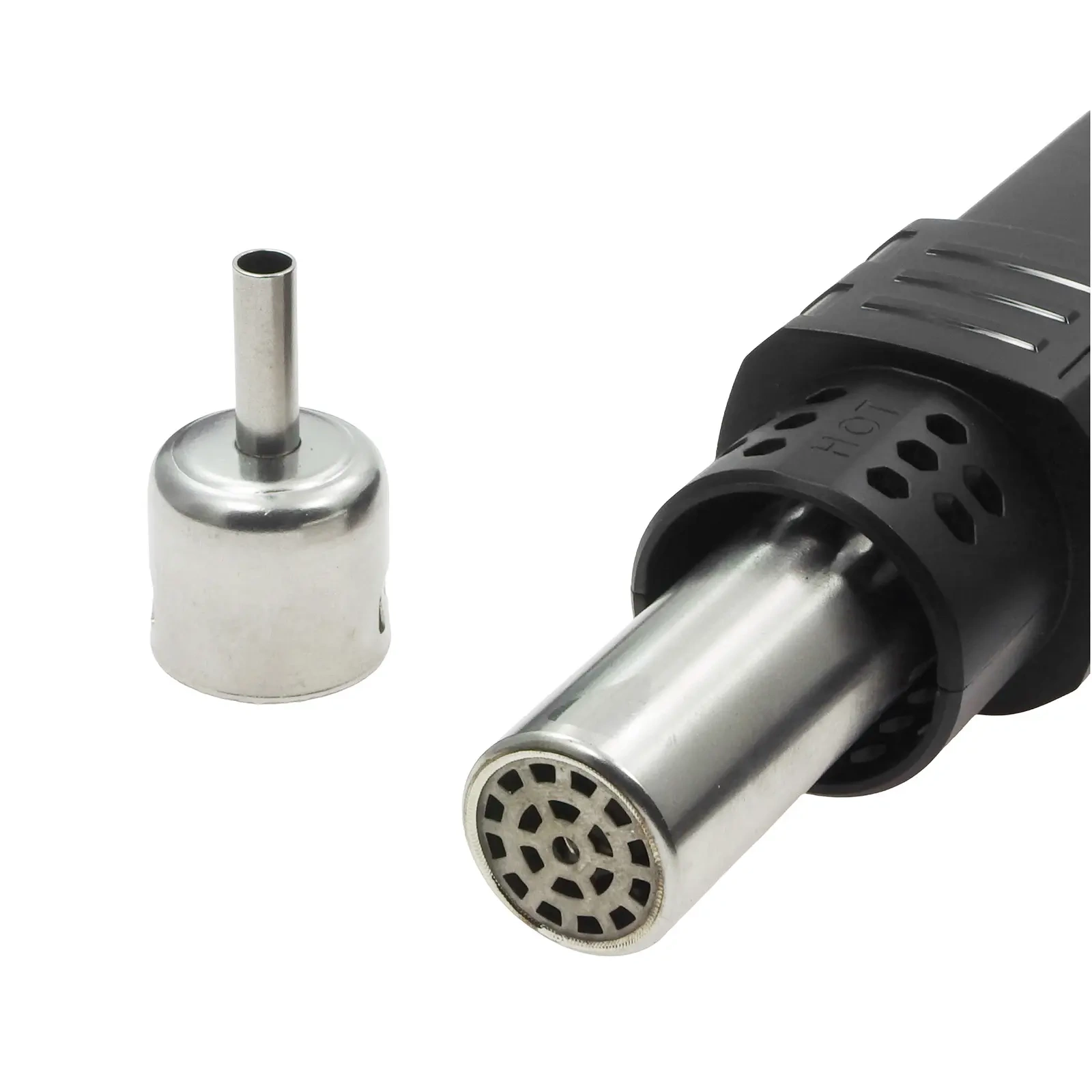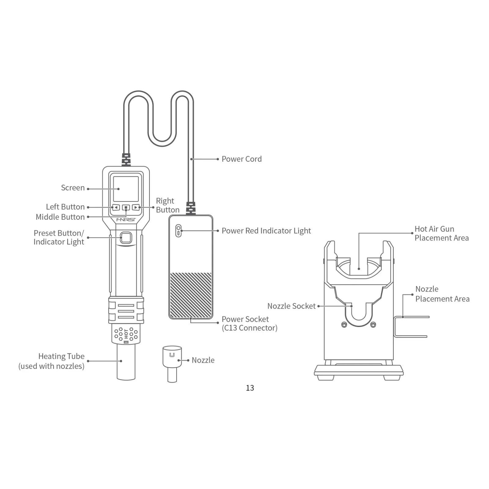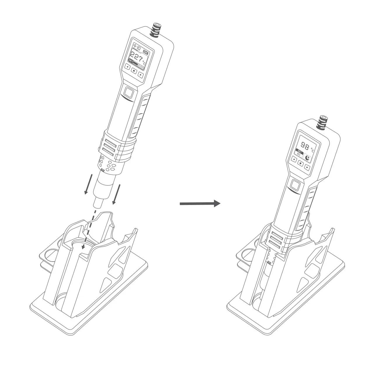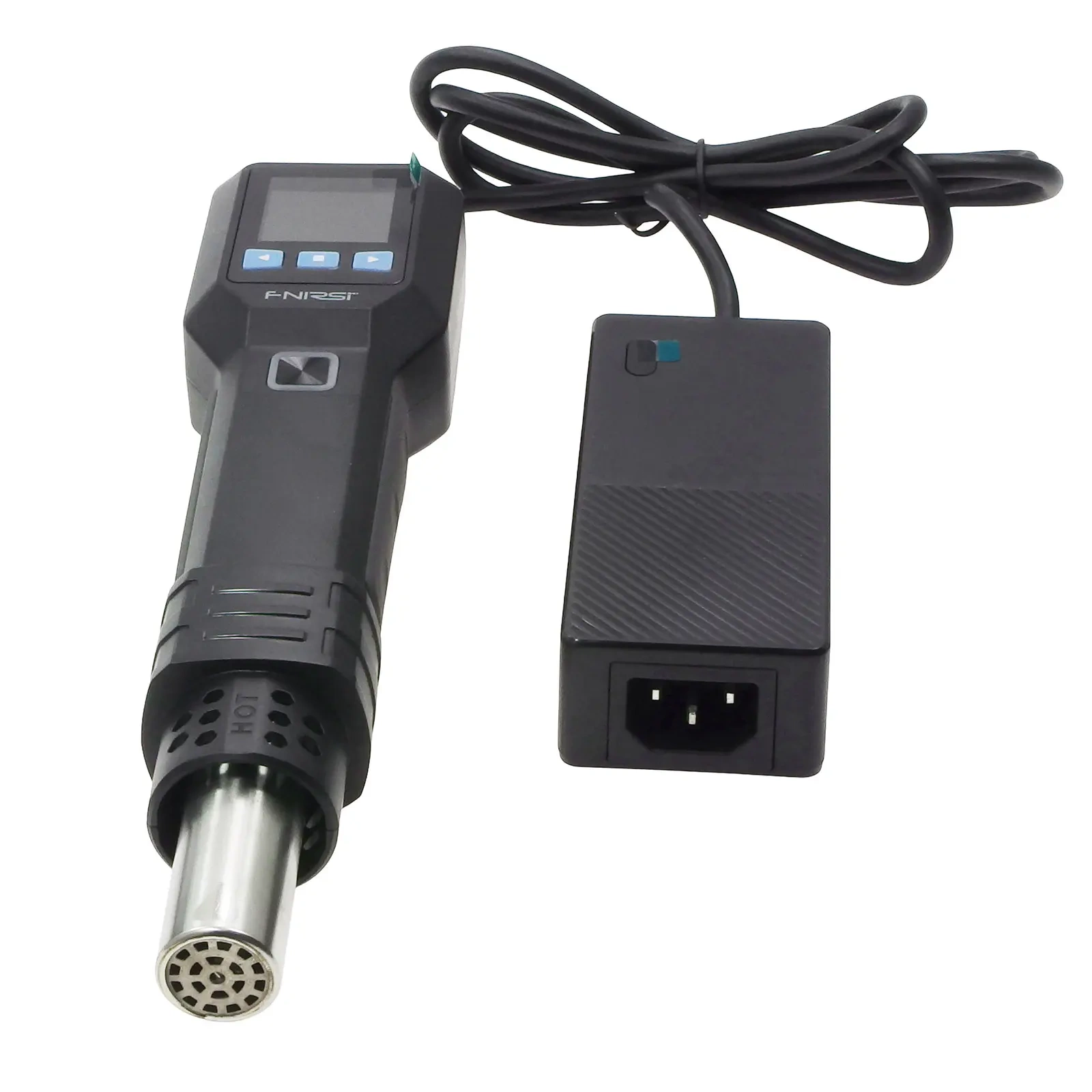 Uchwyt zawiera czujnik magnetyczny, który automatycznie nagrzewa się po podniesieniu i chłodzi po odłożeniu. Kontroler i ekran wyświetlacza na uchwycie umożliwiają łatwą, jednoręczną regulację temperatury i prędkości wiatru. Obsługuje również trzy zestawy szybkich ustawień temperatury/prędkości wiatru do szybkiego przełączania. Funkcja szybkiego chłodzenia przyspiesza chłodzenie, dodatkowo wydłużając żywotność elementu grzejnego. Monitorowanie w czasie rzeczywistym przez różne czujniki zapewnia wyłączenie ogrzewania w przypadku jakichkolwiek nieprawidłowości, zapewniając bezpieczeństwo. Wyświetlacz LCD i wskaźnik LED wyraźnie pokazują status pracy i zmiany temperatury.