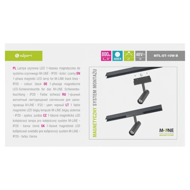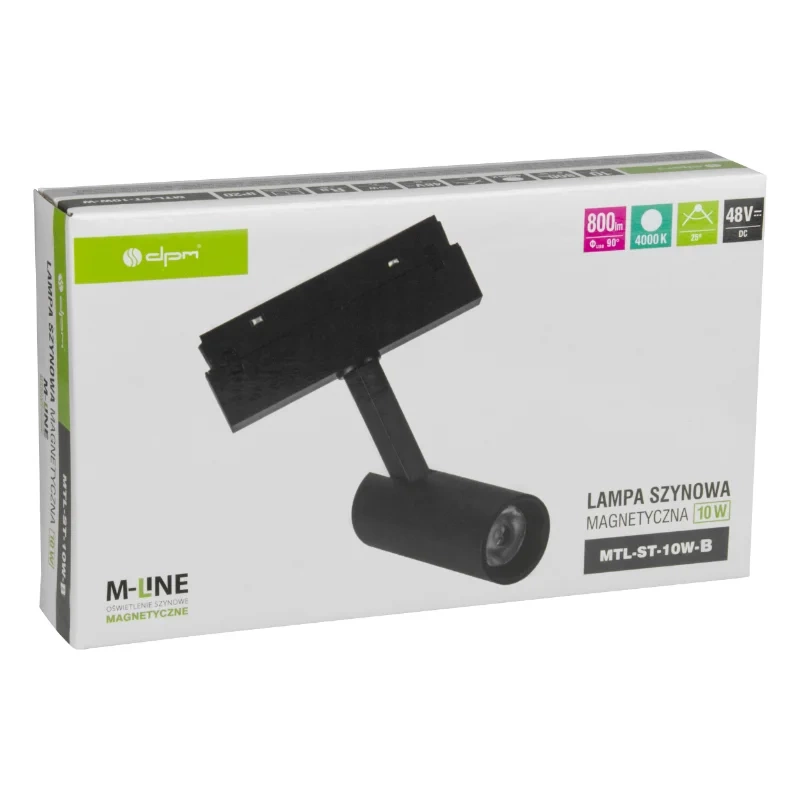 Reflektor szynowy magnetyczny M-LINE MTL-ST-10W to nowoczesna oprawa LED przeznaczona do systemów oświetleniowych M-LINE. Dzięki mocy 10 W i strumieniowi świetlnemu 800 lm zapewnia precyzyjne, jasne i energooszczędne oświetlenie o barwie 4000 K (neutralny biały). Szeroki zakres regulacji umożliwia dokładne skierowanie wiązki światła, a magnetyczny montaż zapewnia prostą i elastyczną instalację w dowolnym miejscu na szynie.