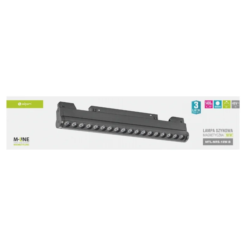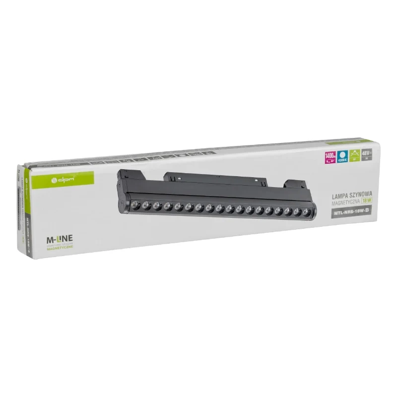 Reflektor szynowy magnetyczny M-LINE MTL-NRS-18W to nowoczesna oprawa LED przeznaczona do systemów oświetleniowych M-LINE. Dzięki mocy 18 W i strumieniowi świetlnemu 1400 lm zapewnia intensywne, równomierne oświetlenie o barwie 4000 K (neutralna biel), które idealnie sprawdza się zarówno w przestrzeniach domowych, jak i komercyjnych. Czarne, matowe wykończenie i smukła forma podkreślają elegancki charakter reflektora, wpisując się w nowoczesny styl oświetlenia magnetycznego.