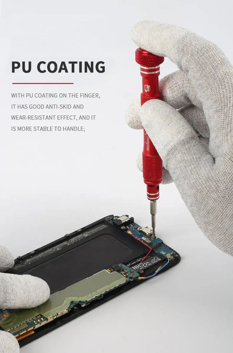 - Jeżeli pracujesz z wyświetlaczami, bateriami lub modułami komunikacyjnymi - PU coating zapewni stabilny chwyt i zminimalizuje ryzyko przypadkowego upuszczenia delikatnych elementów.