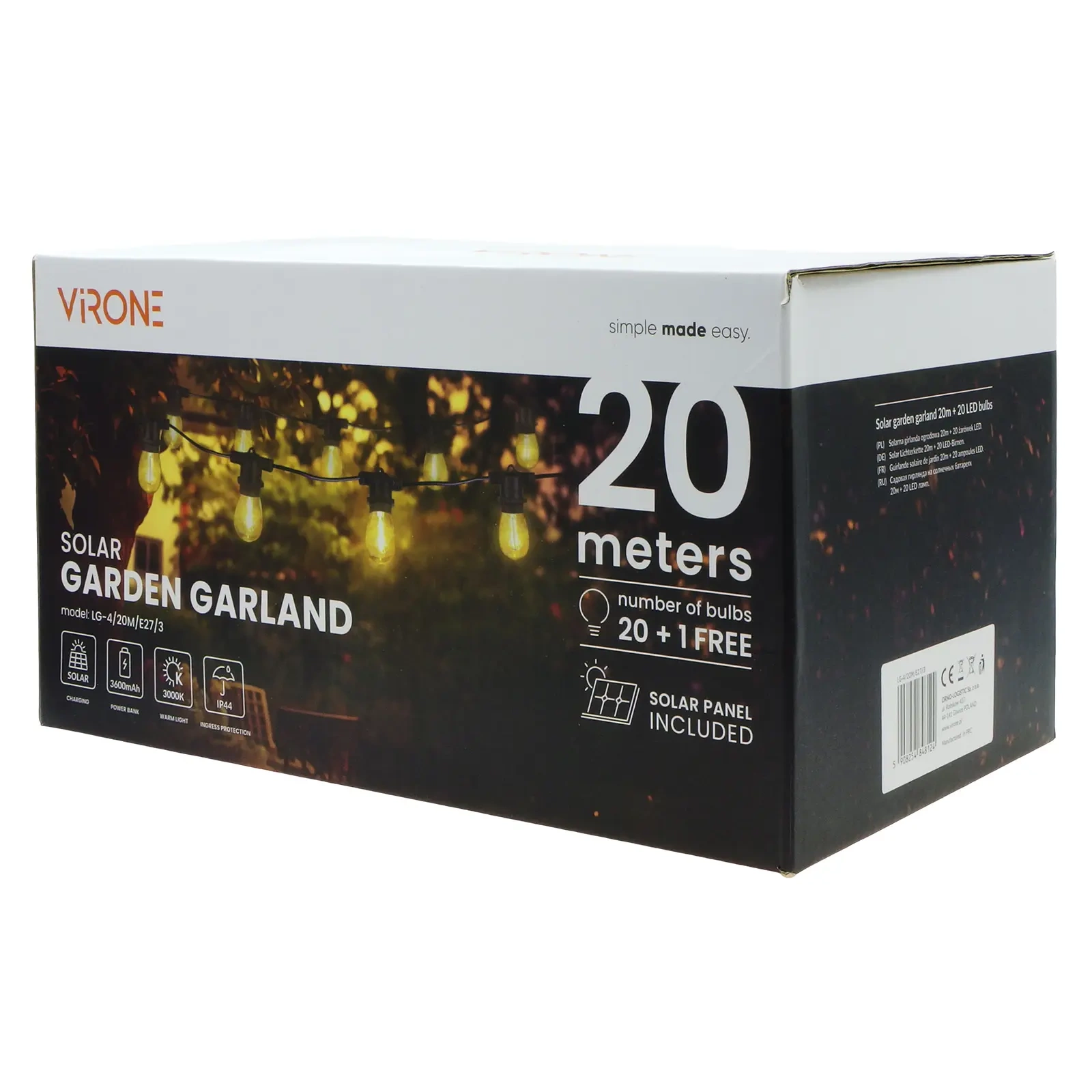 Girlanda solarna LED E27 20m – dekoracyjne oświetlenie ogrodowe bez podłączenia do prądu