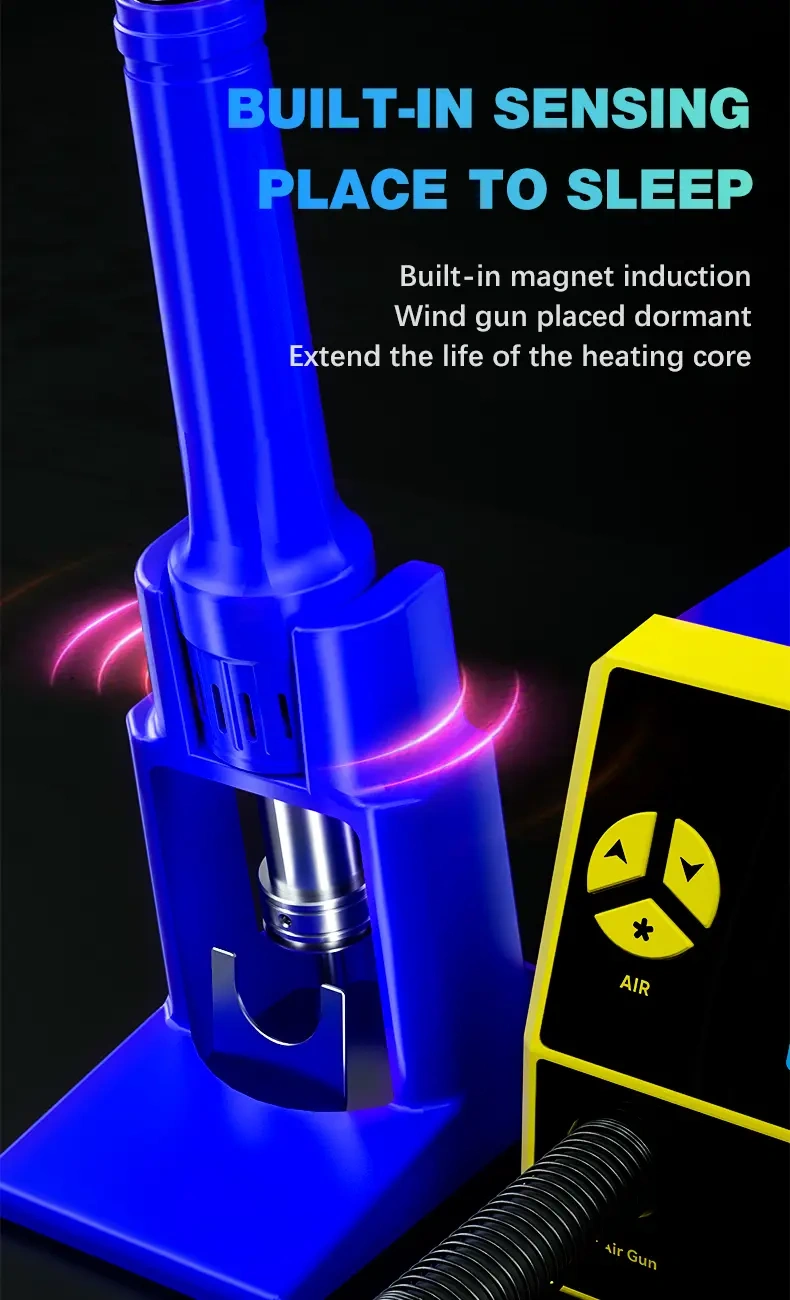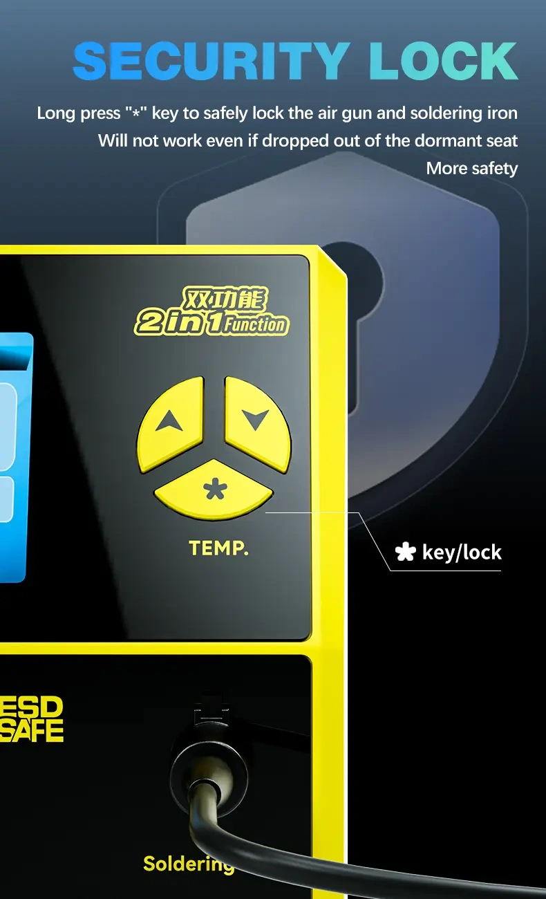 Model 861DS wyposażono w automatyczny tryb uśpienia, aktywowany po odłożeniu rękojeści hot-air lub kolby. Zastosowano również czujnik magnetyczny, który wykrywa położenie rękojeści i wydłuża żywotność elementu grzejnego. Dodatkowym zabezpieczeniem jest blokada ustawień (security lock), chroniąca parametry pracy przed przypadkową zmianą.