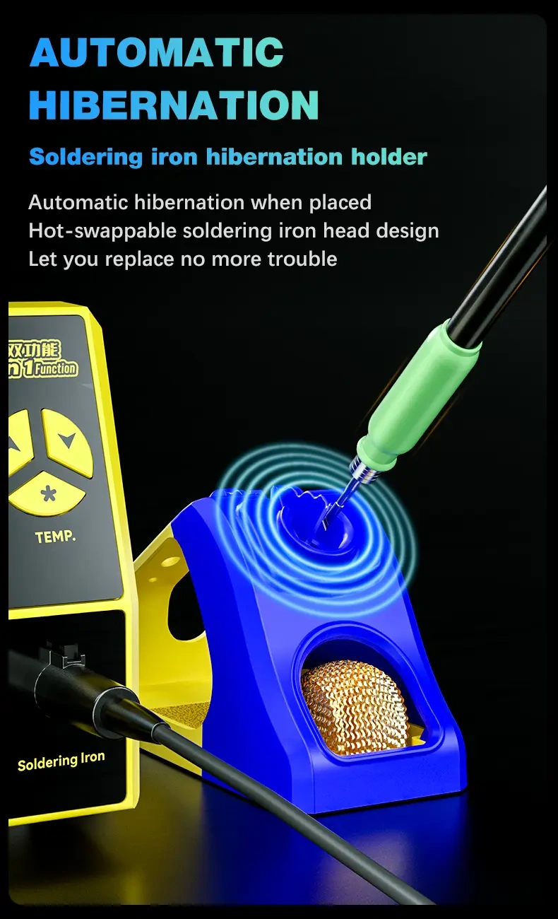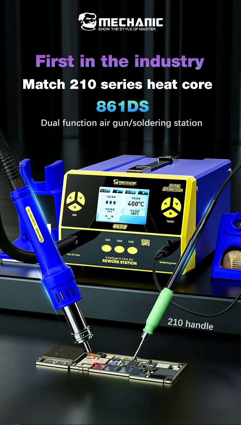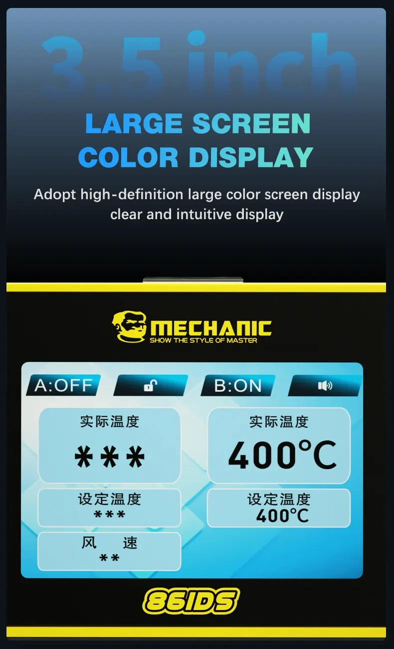 Stacja lutownicza 861DS Mechanic to zaawansowana stacja rework 2w1, łącząca gorące powietrze (hot-air) oraz klasyczną kolbę lutowniczą w jednym urządzeniu. Model ten został wyposażony w rdzeń grzewczy serii 210, co zapewnia szybki wzrost temperatury oraz stabilną pracę przy dużej mocy.