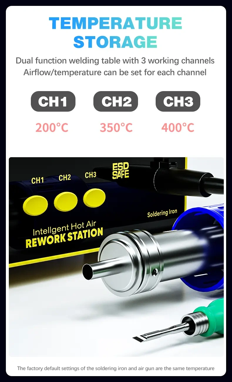 Czytelny wyświetlacz LCD prezentuje temperaturę zadawaną i rzeczywistą, a trzy kanały pamięci (CH1–CH3) umożliwiają zapis indywidualnych ustawień temperatury i nadmuchu. Dzięki temu stacja sprawdza się przy powtarzalnych procesach lutowania i rozlutowywania.