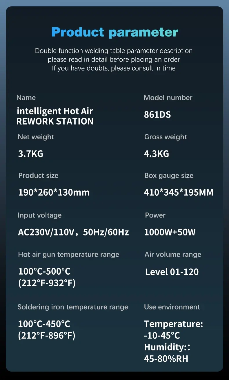 - Zakres temperatury hot-air: 100°C – 500°C (212°F – 932°F)