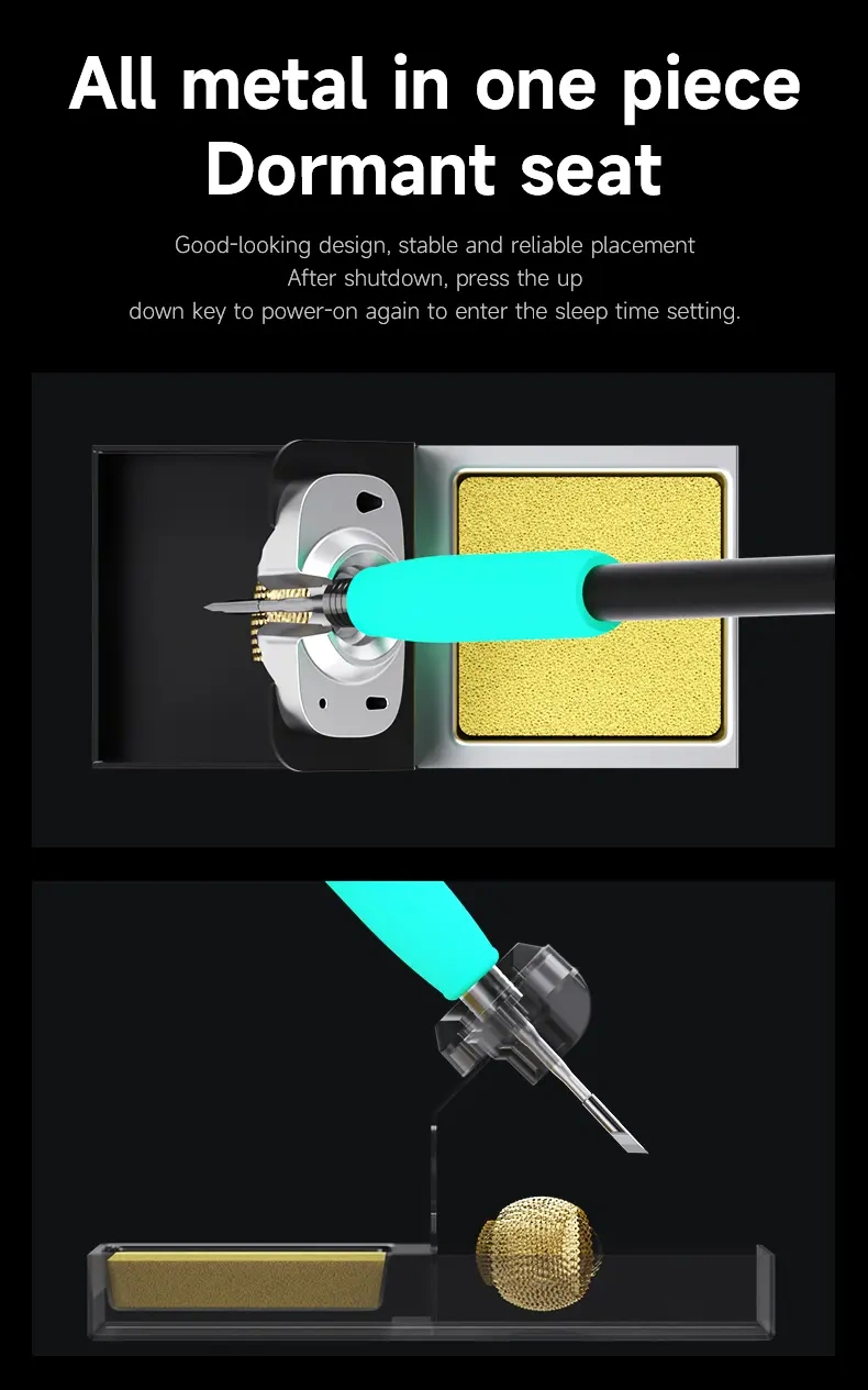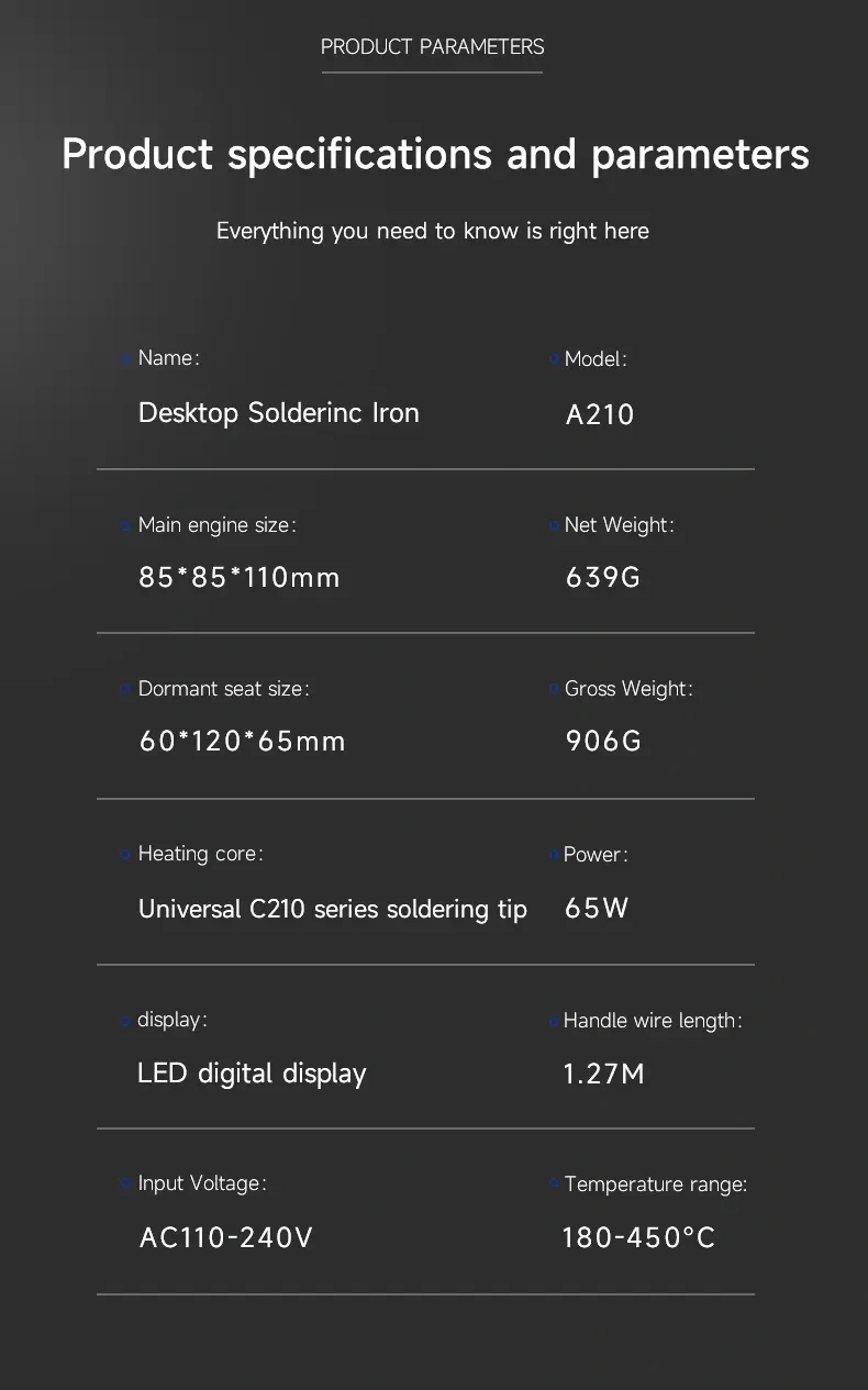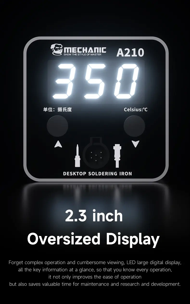 Mechanic A210 oferuje 5 programowalnych presetów temperatury, szybkie przełączanie trybów pracy oraz regulację zarówno w °C, jak i w °F. W zestawie znajduje się solidny metalowy stojak z mosiężnym czyścikiem, co ułatwia zachowanie grotu w idealnym stanie.
