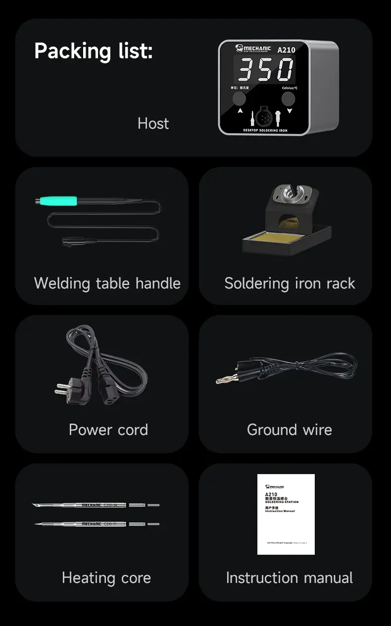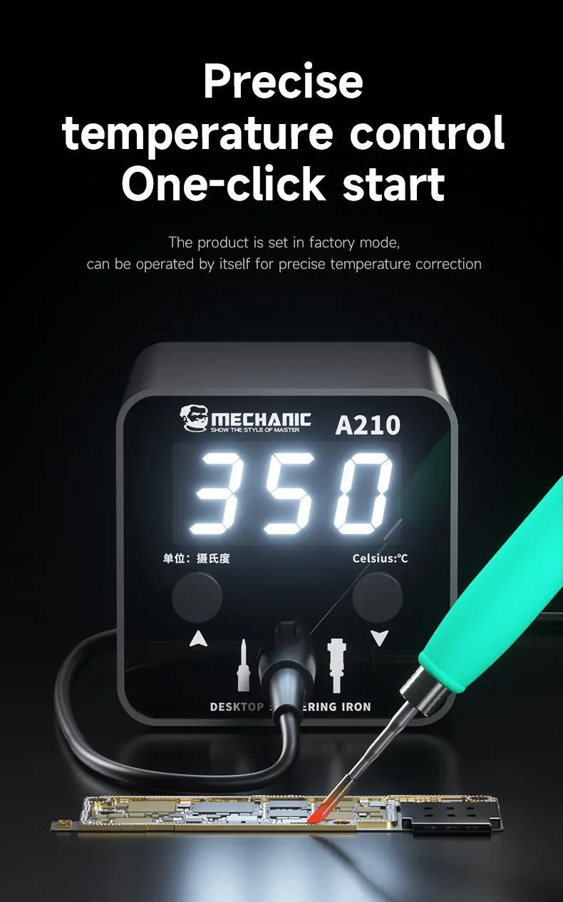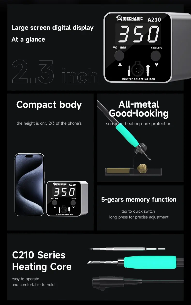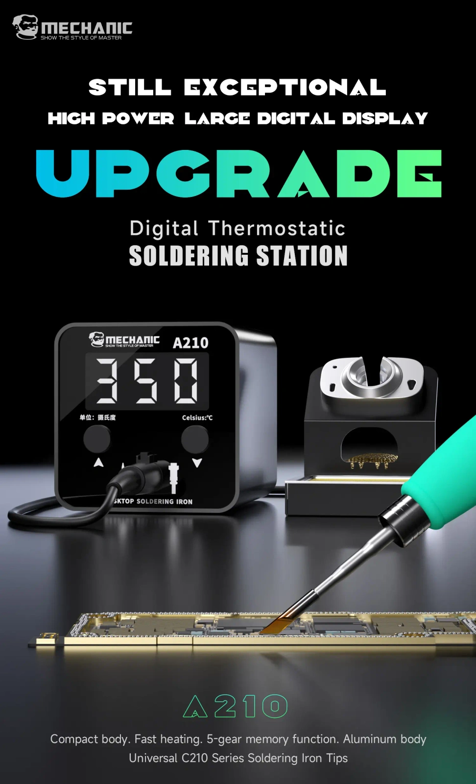 Mechanic A210 to nowoczesna, biurkowa stacja lutownicza zaprojektowana z myślą o serwisach GSM, elektronice precyzyjnej oraz zastosowaniach hobbystycznych i profesjonalnych. Dzięki zastosowaniu grotów z serii C210, urządzenie osiąga błyskawiczne nagrzewanie, stabilną temperaturę oraz doskonałą kontrolę procesu lutowania nawet przy najbardziej wymagających pracach.