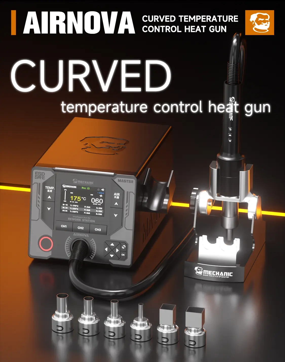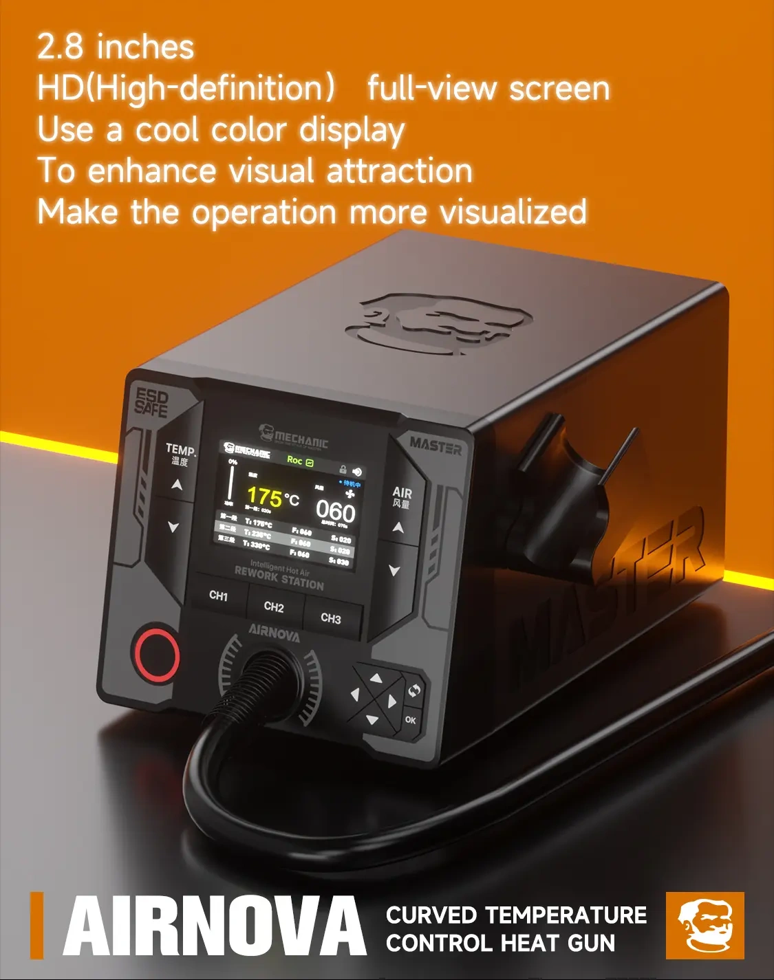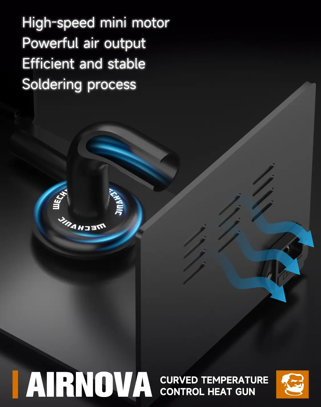 AIRNOVA Mechanic to nowoczesna stacja gorącego powietrza (hot-air) zaprojektowana z myślą o serwisach elektroniki, hobbystach oraz technikach SMT. Urządzenie wykorzystuje miniaturowy silnik wysokiej prędkości oraz czytelny ekran HD 2,8", co gwarantuje stabilną pracę i precyzyjną kontrolę temperatury.
