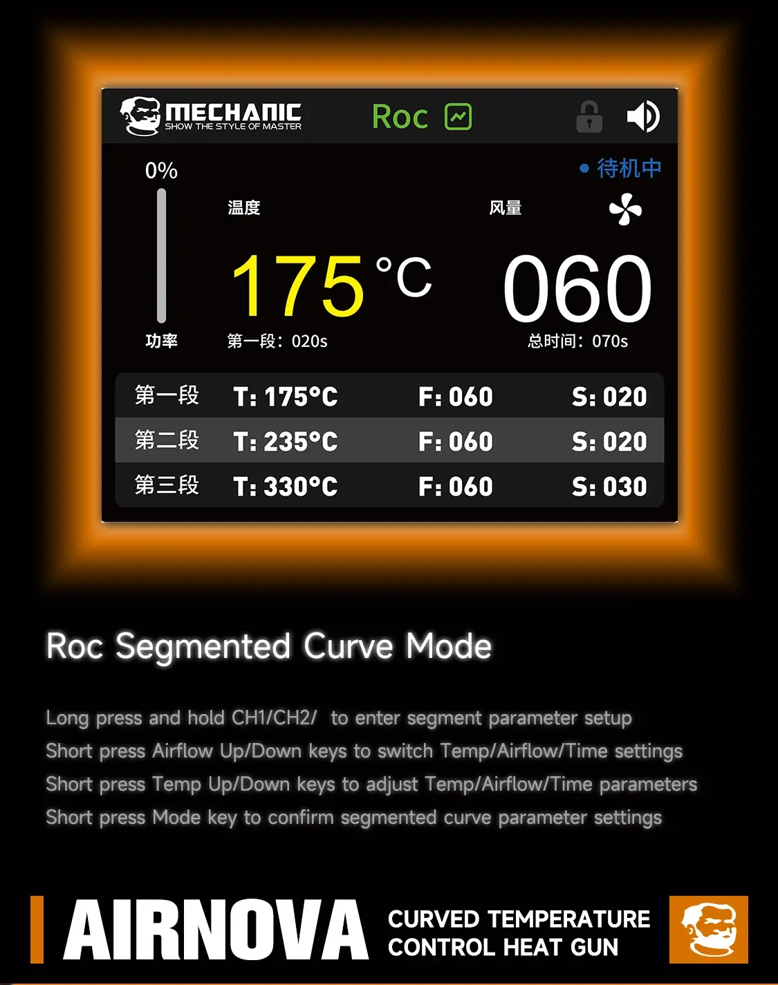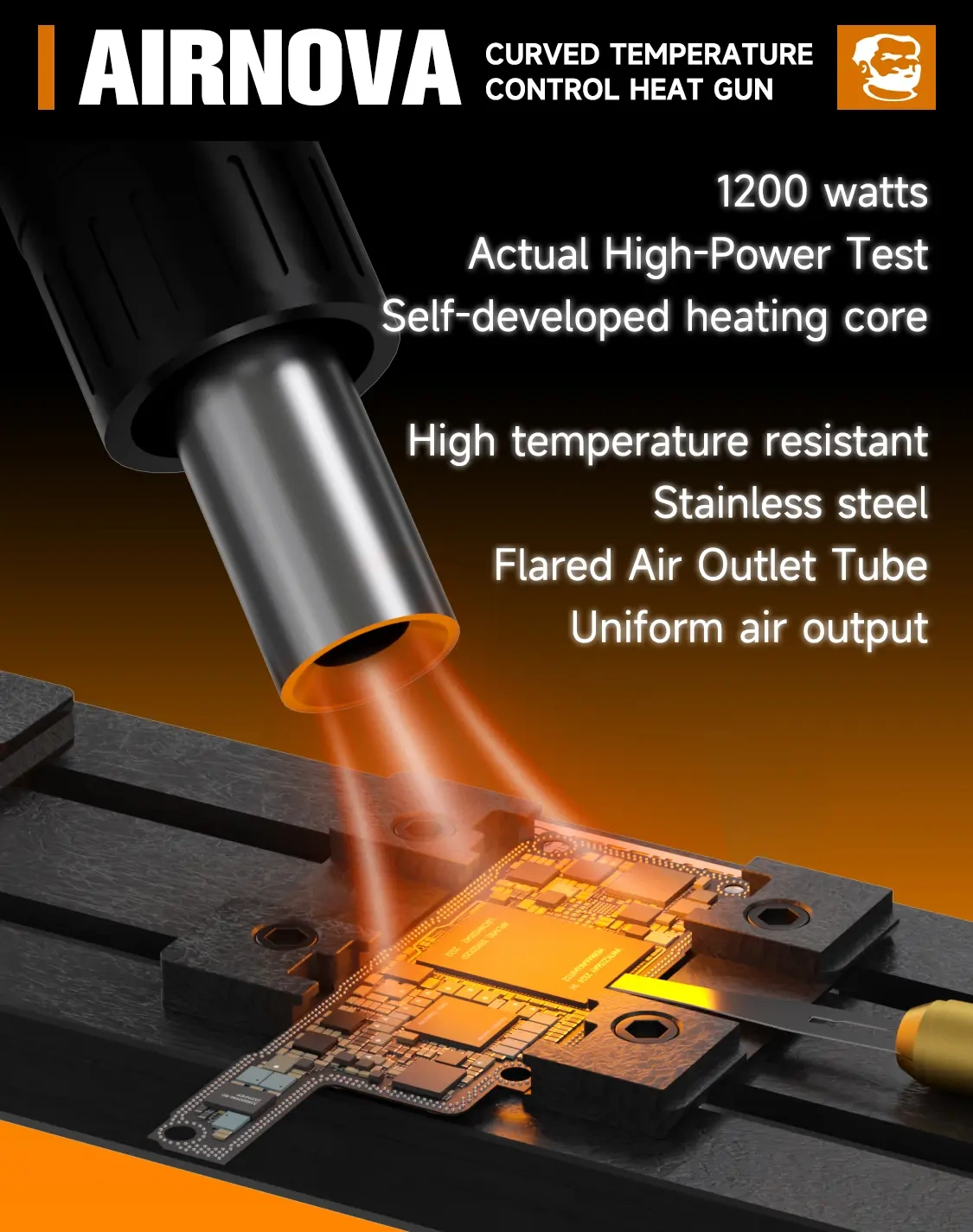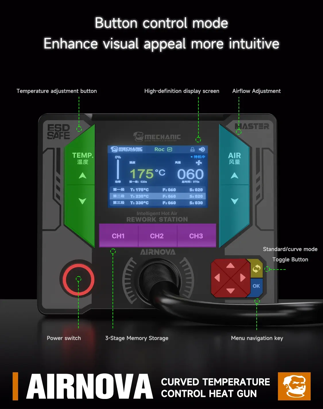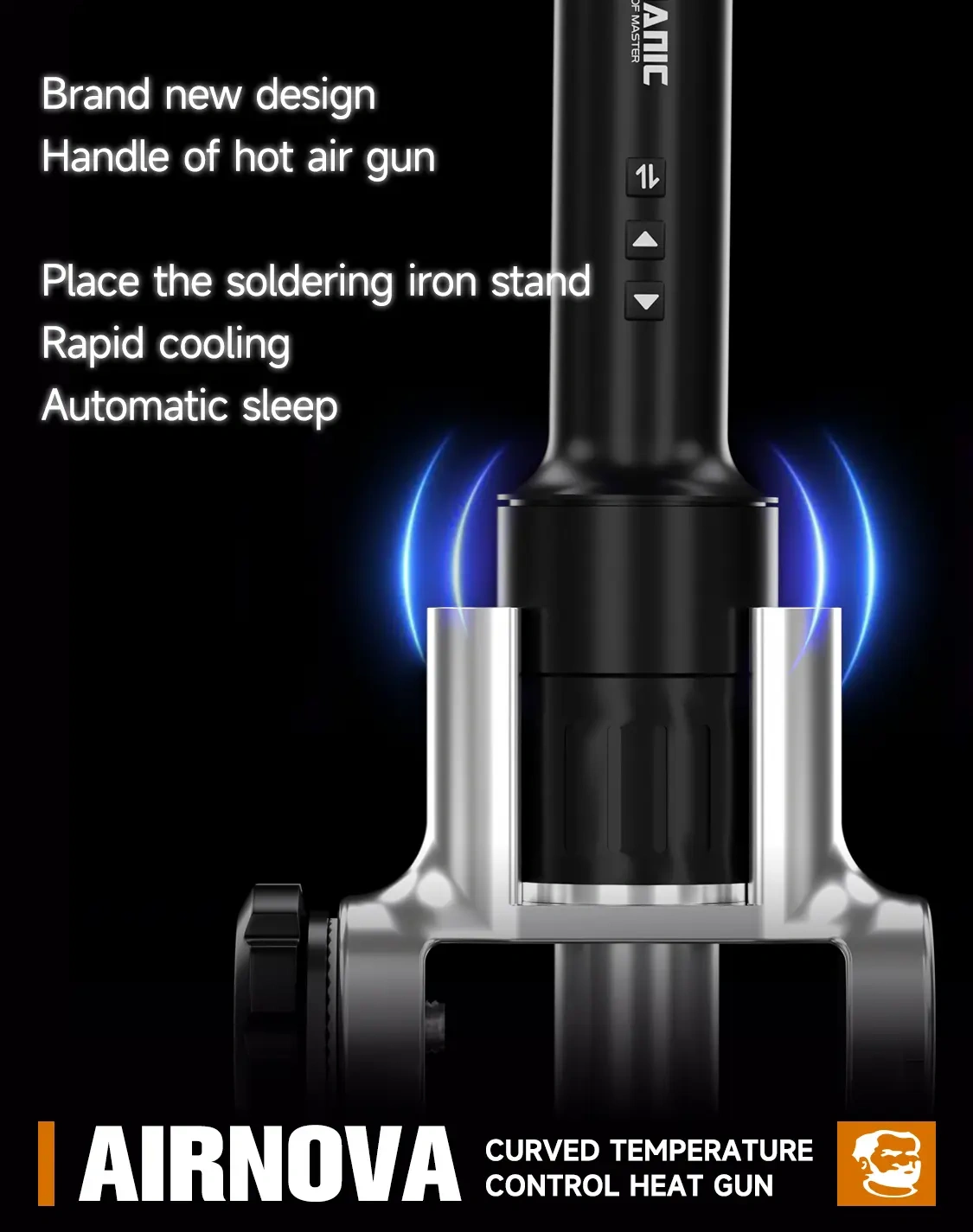 AIRNOVA Mechanic to nowoczesna stacja gorącego powietrza (hot-air) zaprojektowana z myślą o serwisach elektroniki, hobbystach oraz technikach SMT. Urządzenie wykorzystuje miniaturowy silnik wysokiej prędkości oraz czytelny ekran HD 2,8", co gwarantuje stabilną pracę i precyzyjną kontrolę temperatury.