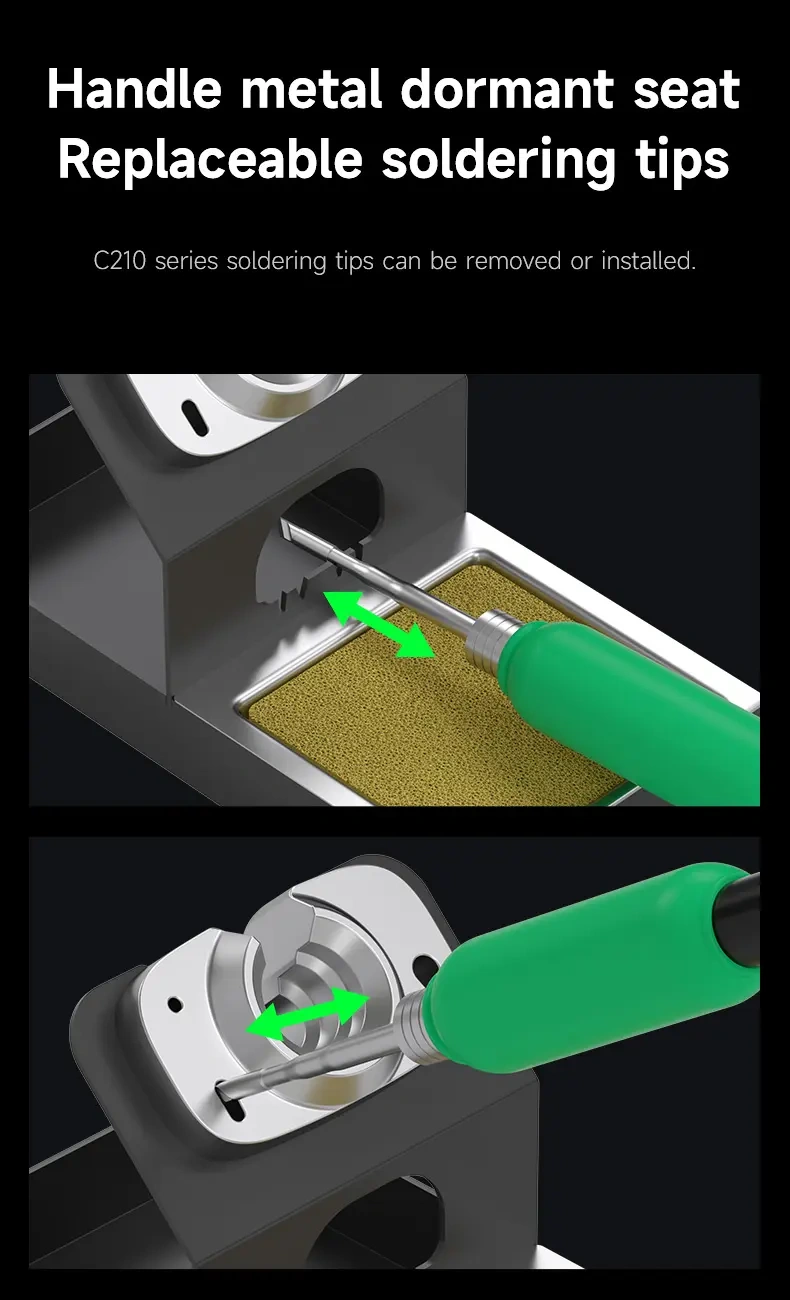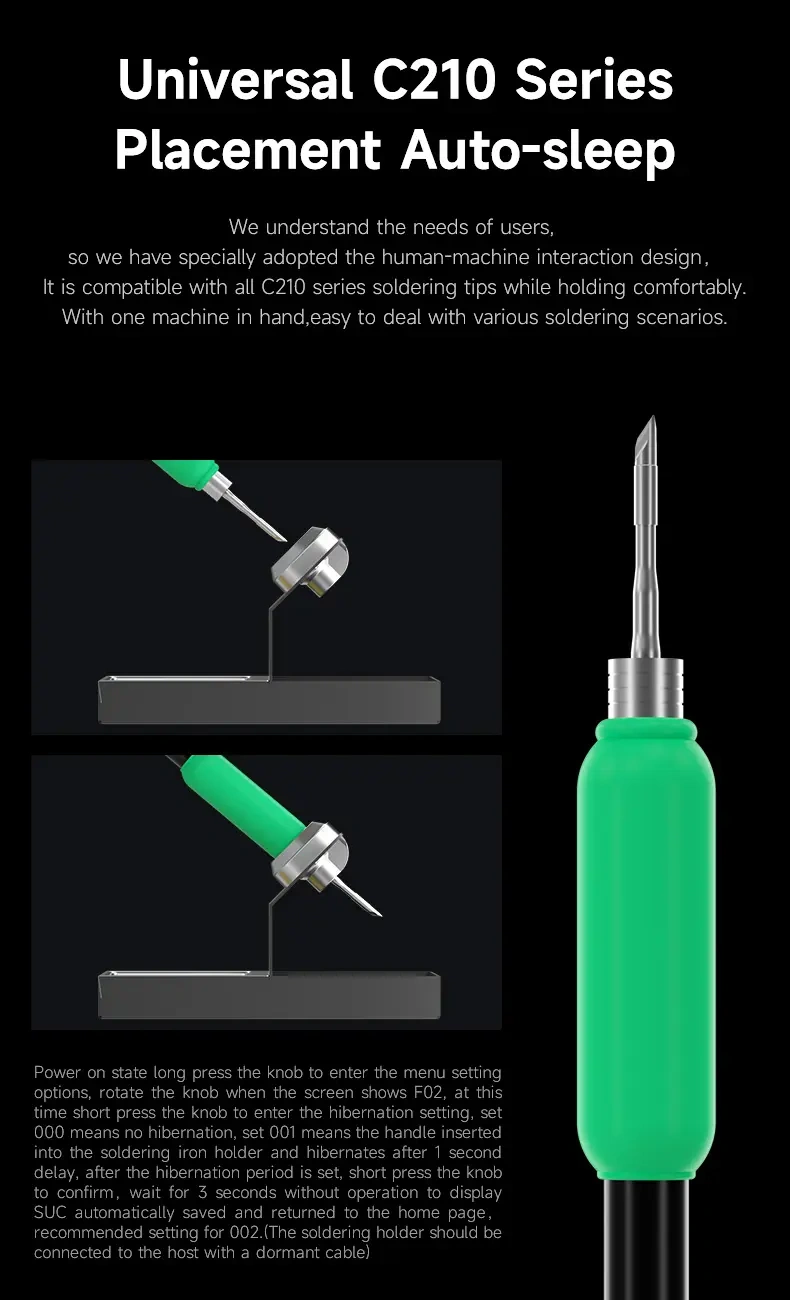 Model T210 SE został wyposażony w automatyczny tryb uśpienia, aktywowany po odłożeniu kolby do metalowego uchwytu. Funkcja ta wydłuża żywotność grota oraz poprawia bezpieczeństwo pracy. Konstrukcja uchwytu umożliwia szybką wymianę grotów C210, co zwiększa uniwersalność stacji.