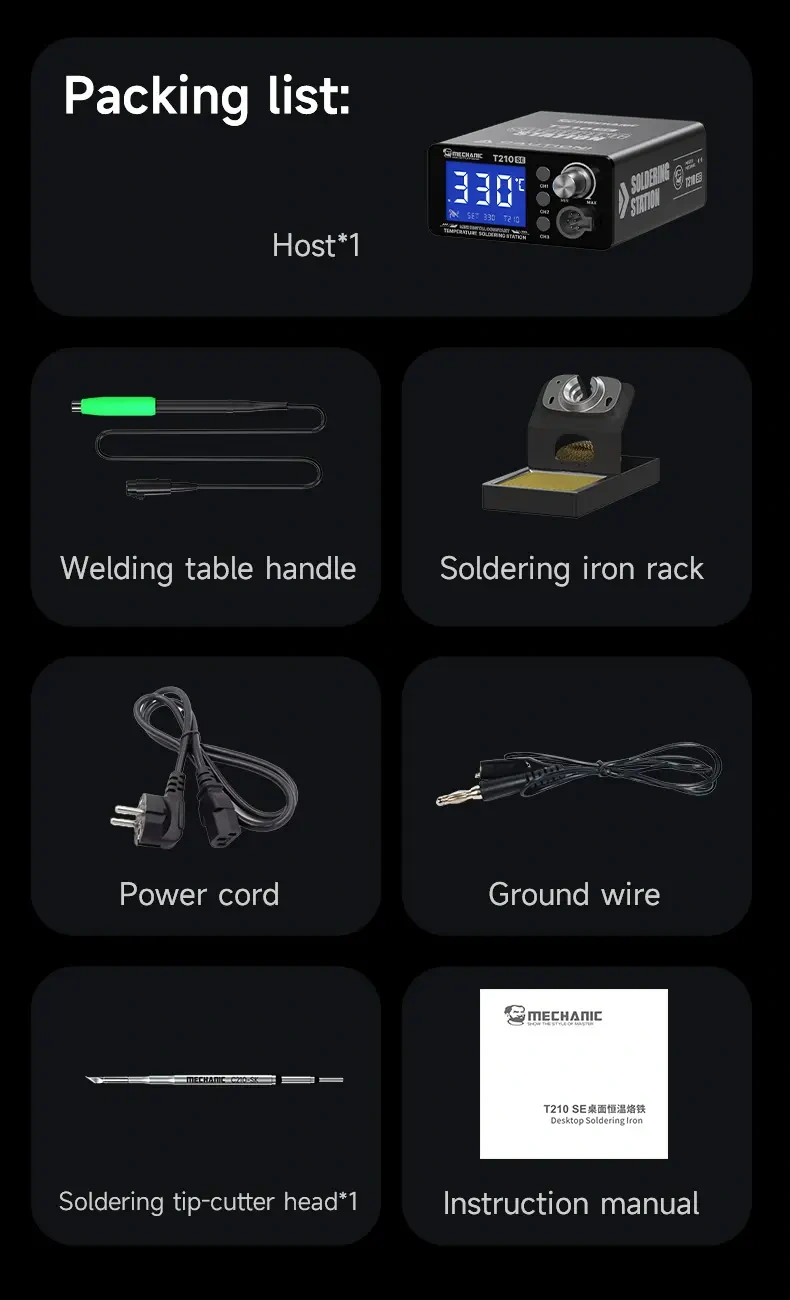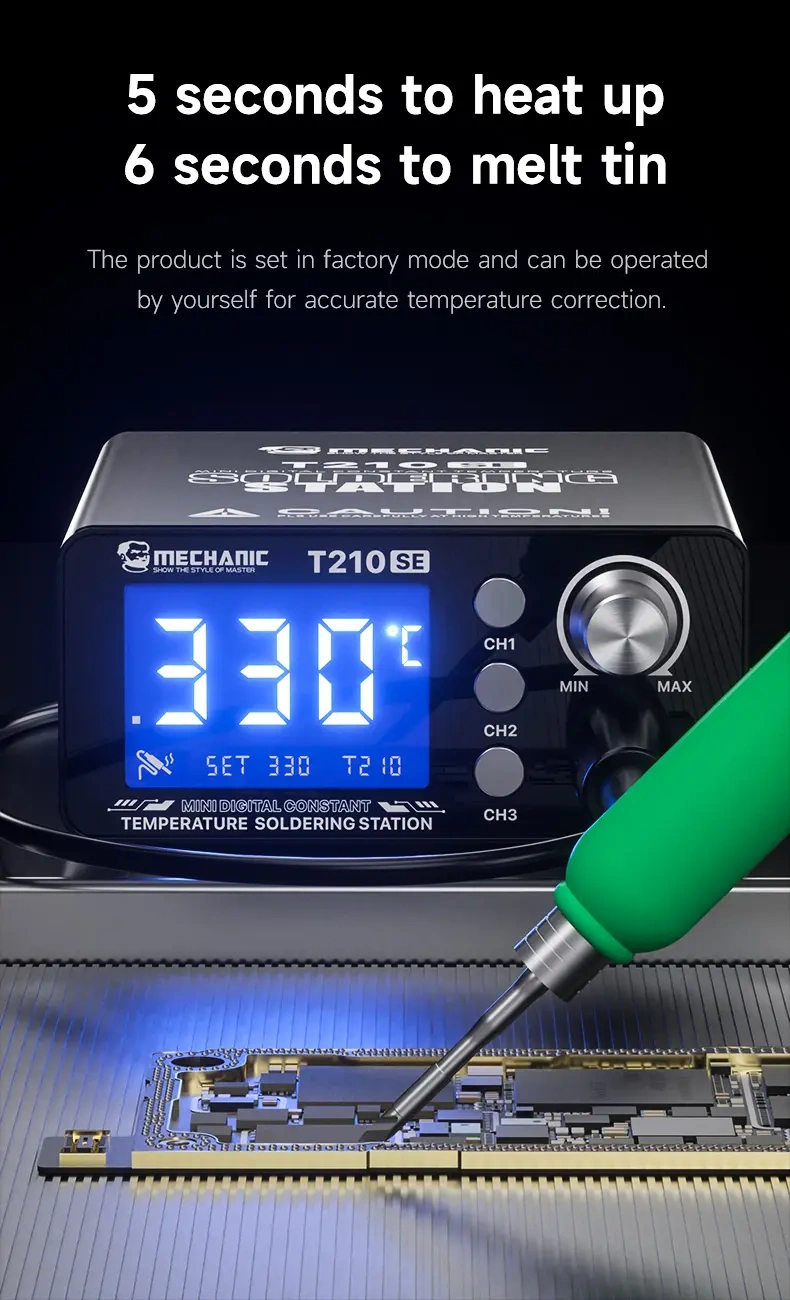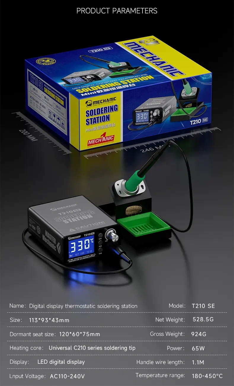 Stacja lutownicza T210 SE Mechanic to kompaktowa, wysokowydajna stacja lutownicza z cyfrową regulacją temperatury, przeznaczona do precyzyjnych prac montażowych i serwisowych w elektronice. Model ten wykorzystuje uniwersalne groty serii C210, co pozwala na bardzo szybkie nagrzewanie oraz stabilną pracę nawet przy lutowaniu elementów o dużej gęstości wyprowadzeń.