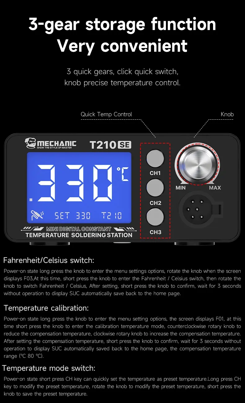 Stacja oferuje trzy kanały pamięci (CH1–CH3) umożliwiające szybkie przełączanie pomiędzy zapisanymi wartościami temperatury. Regulacja odbywa się za pomocą precyzyjnego pokrętła, które umożliwia płynne ustawianie parametrów oraz dostęp do menu konfiguracyjnego, w tym kalibracji temperatury i wyboru jednostek °C / °F.
