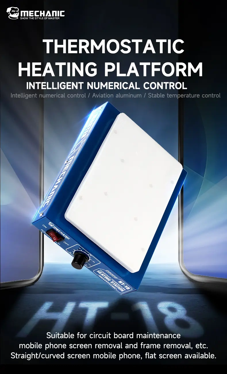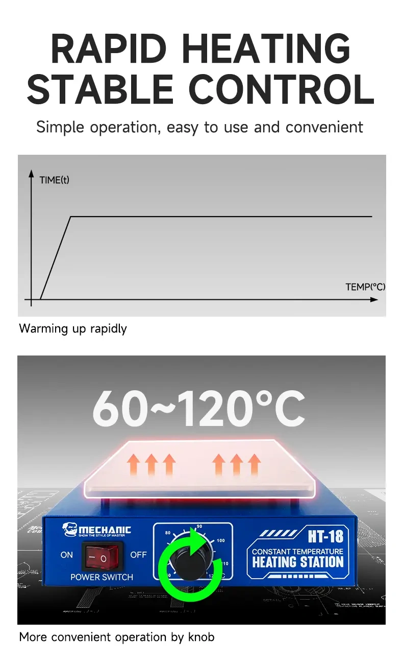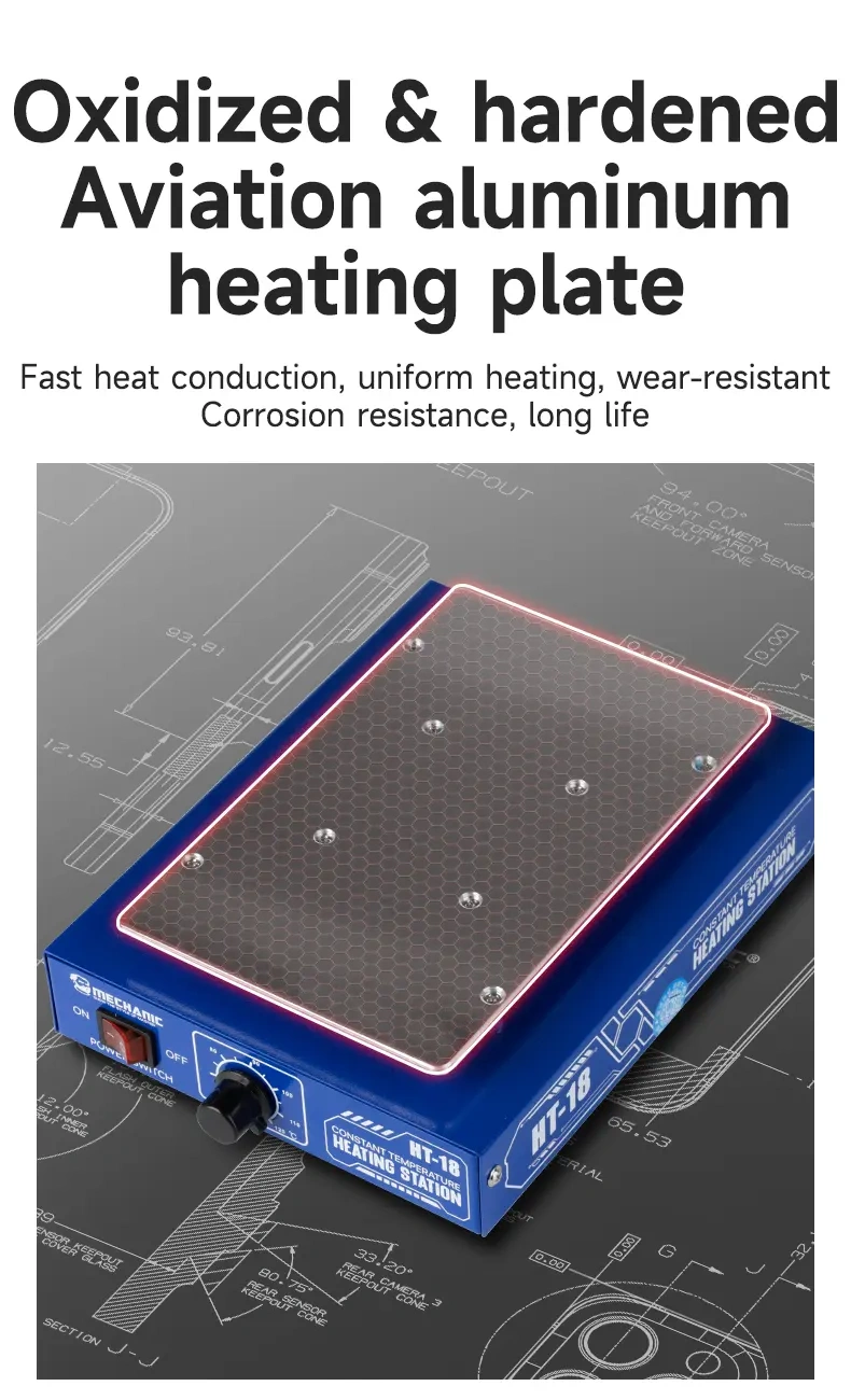 Stół grzewczy HT-18 Mechanic to kompaktowa platforma grzewcza z termostatyczną kontrolą temperatury, zaprojektowana do pracy w serwisach elektroniki oraz wszędzie tam, gdzie wymagane jest stabilne i równomierne podgrzewanie. Urządzenie umożliwia szybkie nagrzewanie i utrzymanie zadanej temperatury w zakresie 60–120°C, co czyni je praktycznym narzędziem do wielu zastosowań technicznych.