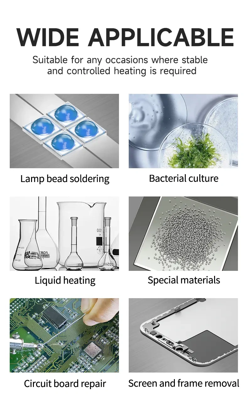 Urządzenie znajduje zastosowanie m.in. przy demontażu ekranów prostych i zakrzywionych, pracy z płytkami PCB, lutowaniu elementów, podgrzewaniu cieczy czy obróbce wybranych materiałów wymagających kontrolowanego nagrzewania.