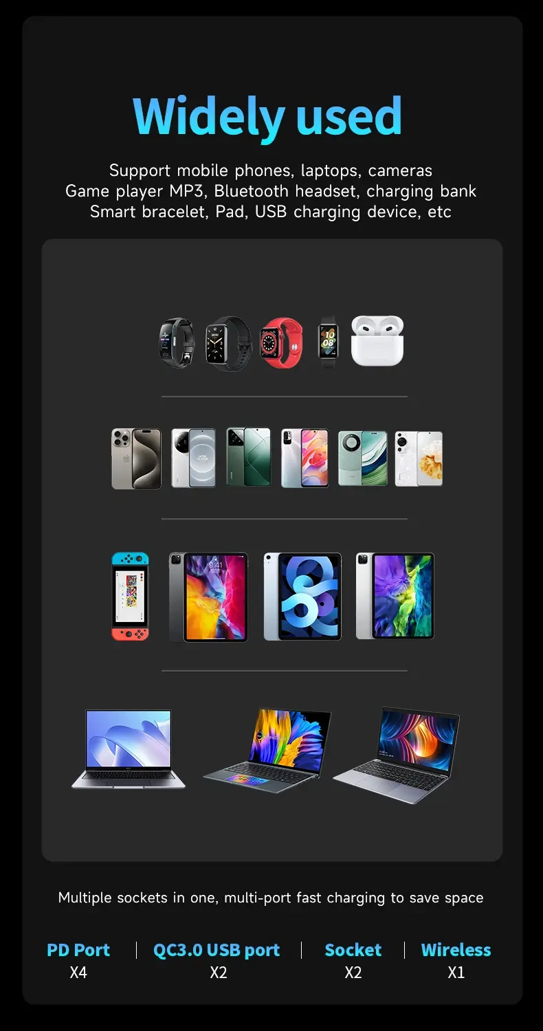 - Przy ładowaniu wielu urządzeń jednocześnie system sam zarządza priorytetami mocy.