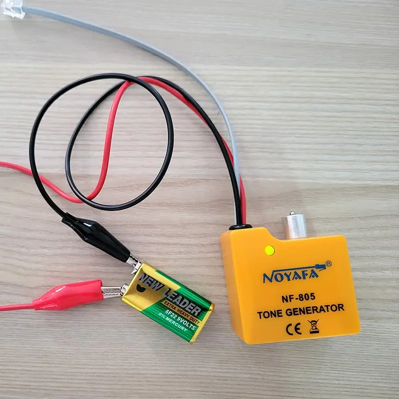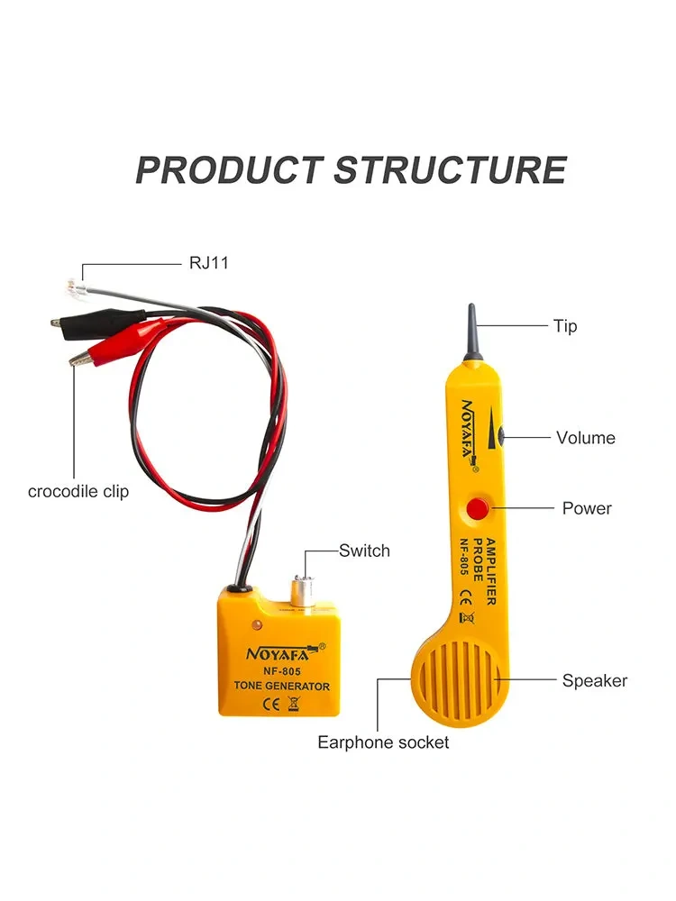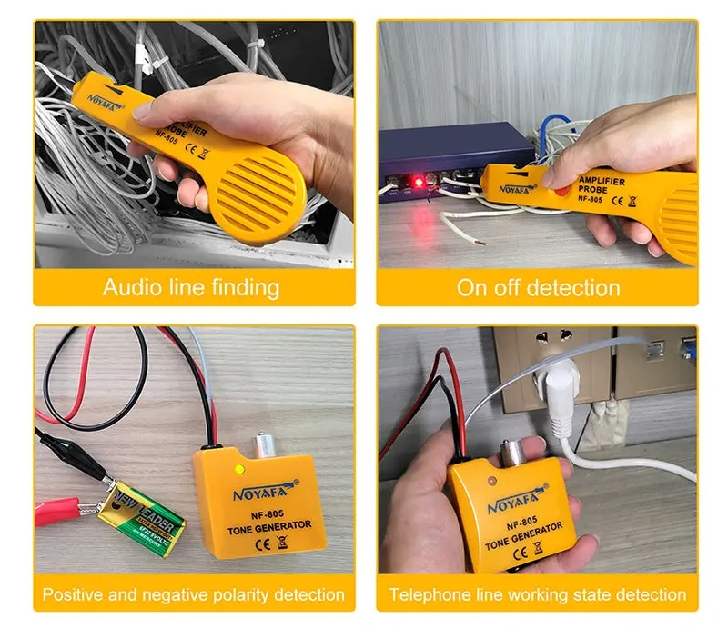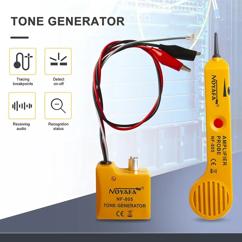 NOYAFA NF-805 to zestaw generatora tonu (Tone Generator) i sondy (Amplifier Probe) do szybkiej identyfikacji przewodów, par i kabli w wiązkach oraz do wykrywania typowych usterek instalacji niskonapięciowych. Urządzenie służy do trasowania kabli, lokalizowania końcówek oraz znajdowania przerw i zwarć w przewodach telefonicznych, przewodach skrętki, a także w wielu innych kablach sygnałowych.