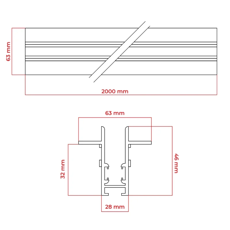 - Profil wykonany z aluminium – lekki, trwały, o szerokości 63 mm