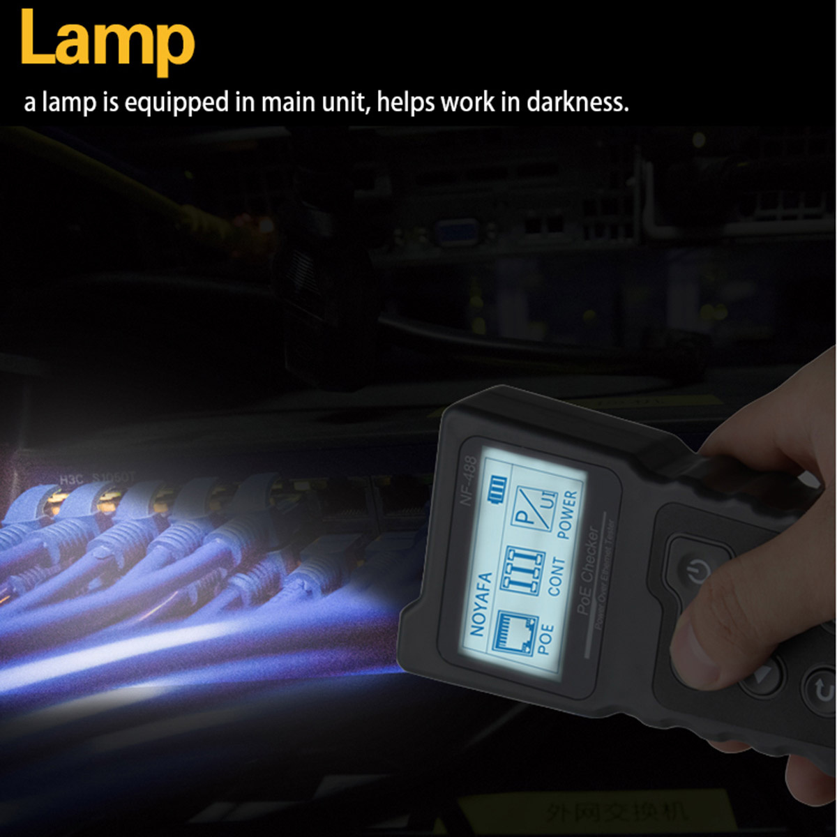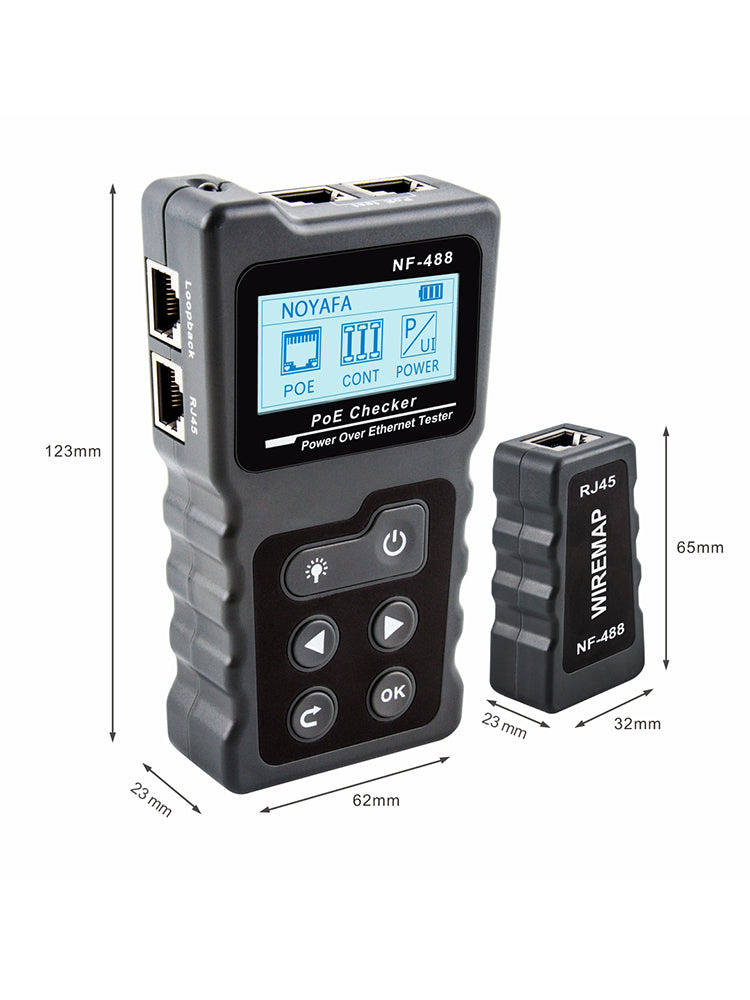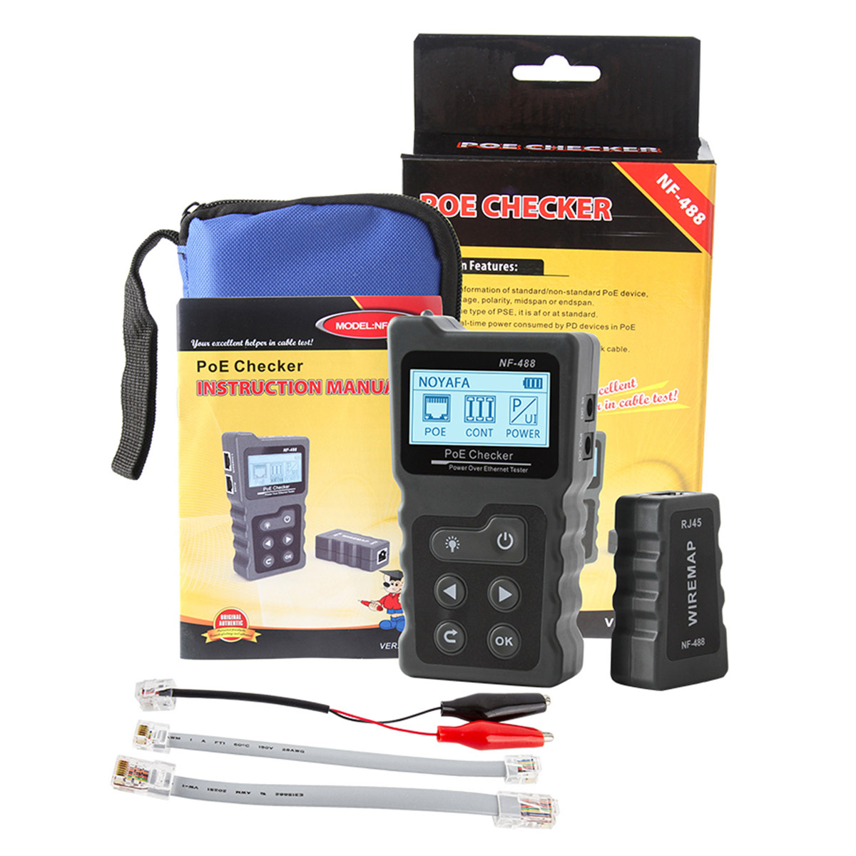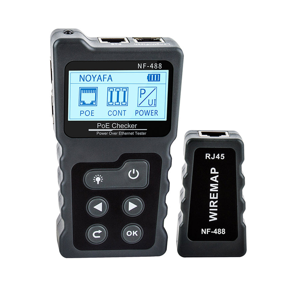 Noyafa NF-488 jest niezastąpionym urządzeniem do testów instalacji z PoE. Urządzenie rozpoznaje na których liniach występuje napięcie, podaje jego wartość oraz określa standard PoE. Można je również włączyć szeregowo pomiędzy switch a zasilane urządzenie, dzięki czemu uzyskamy informację o poborze prądu i pobieranej przez odbiornik mocy.
